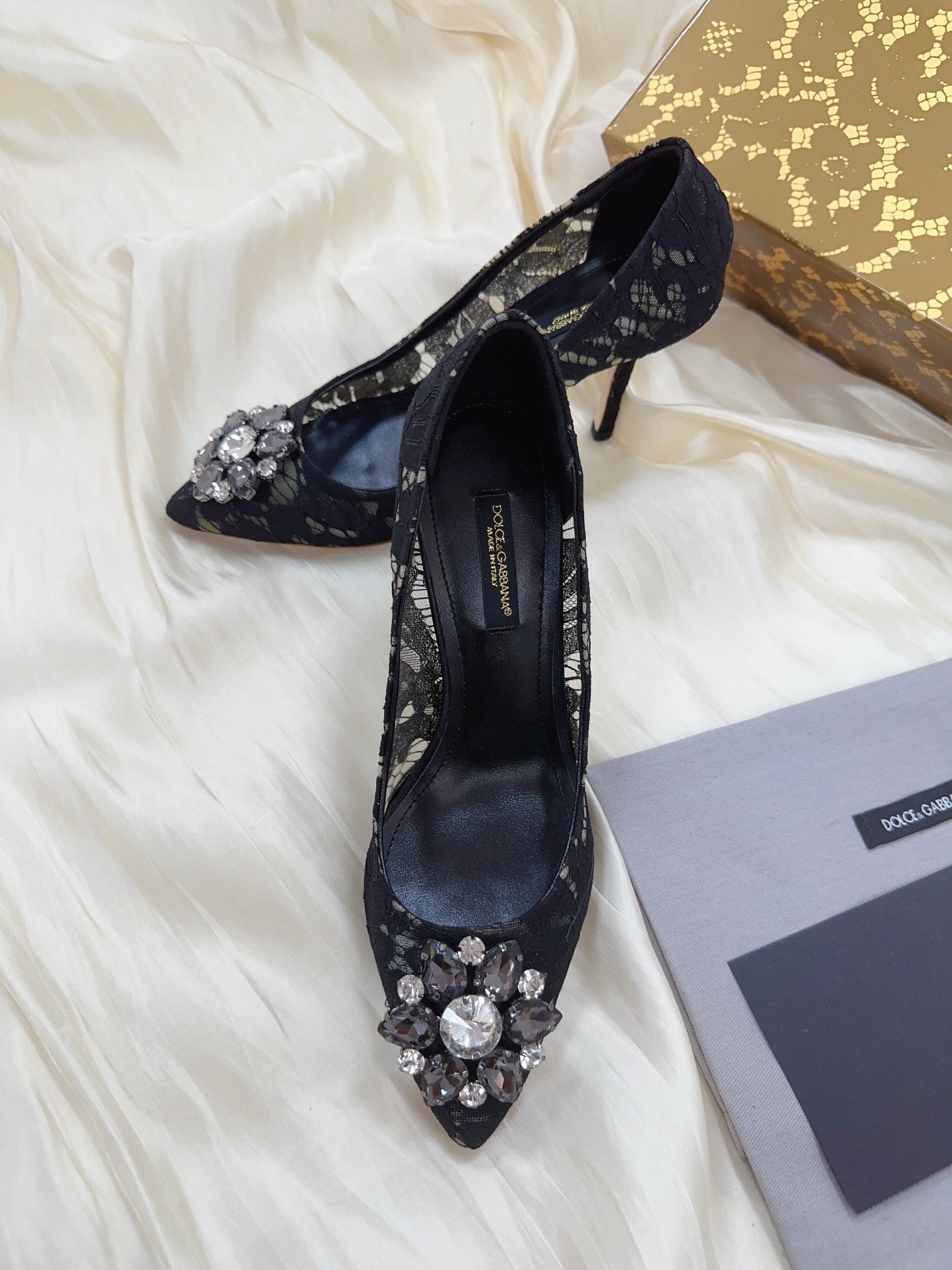DC Floral Crystal Pumps Black Genuine Leather & Lace 324775