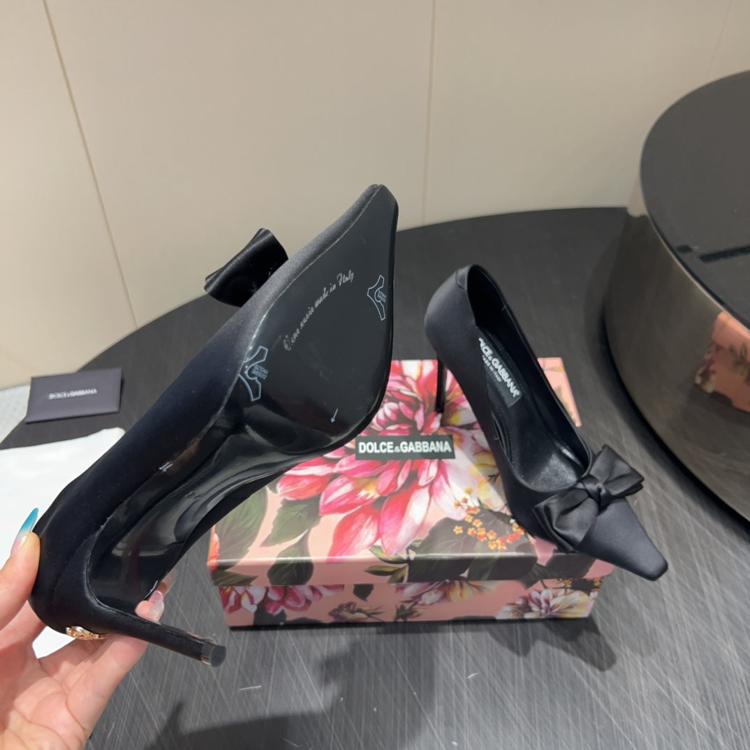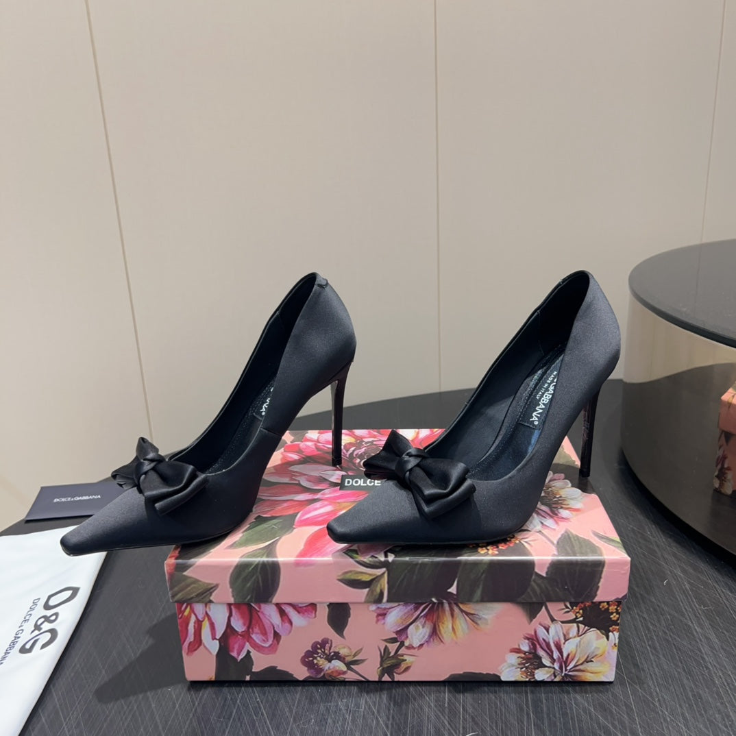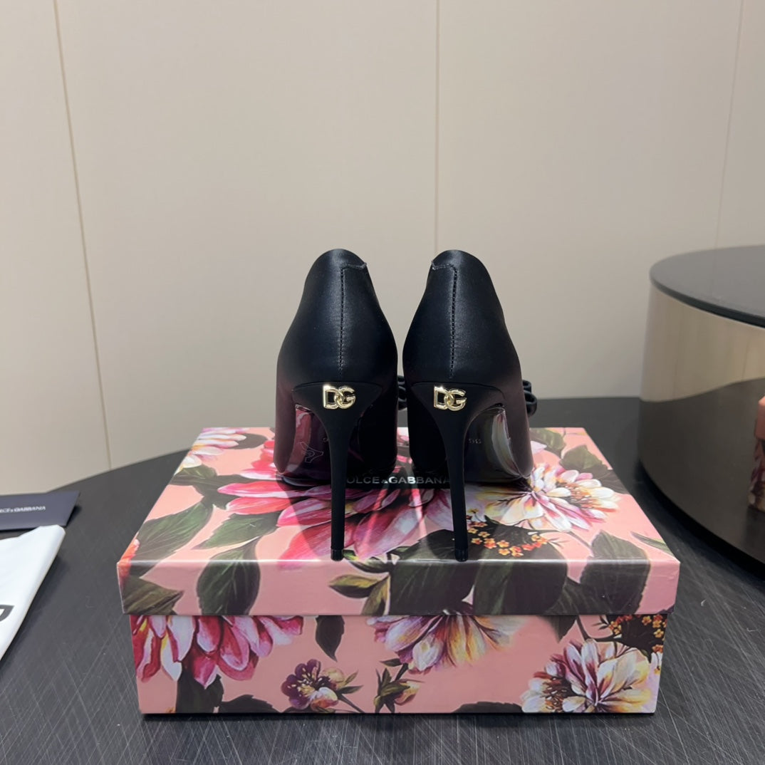 DC 25 Toe Bow High Heel Shoes 100mm Black Silk And Sheepskin 381609