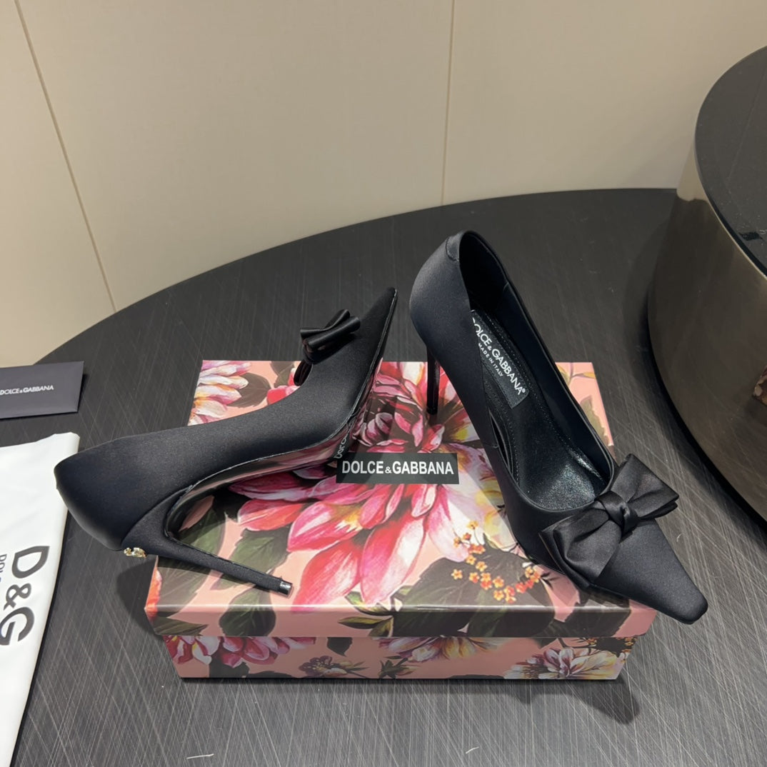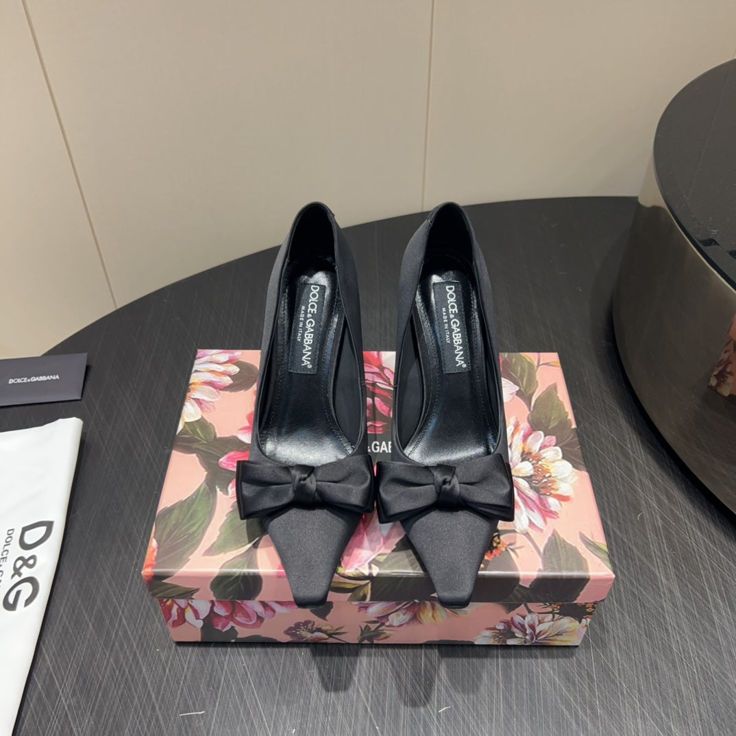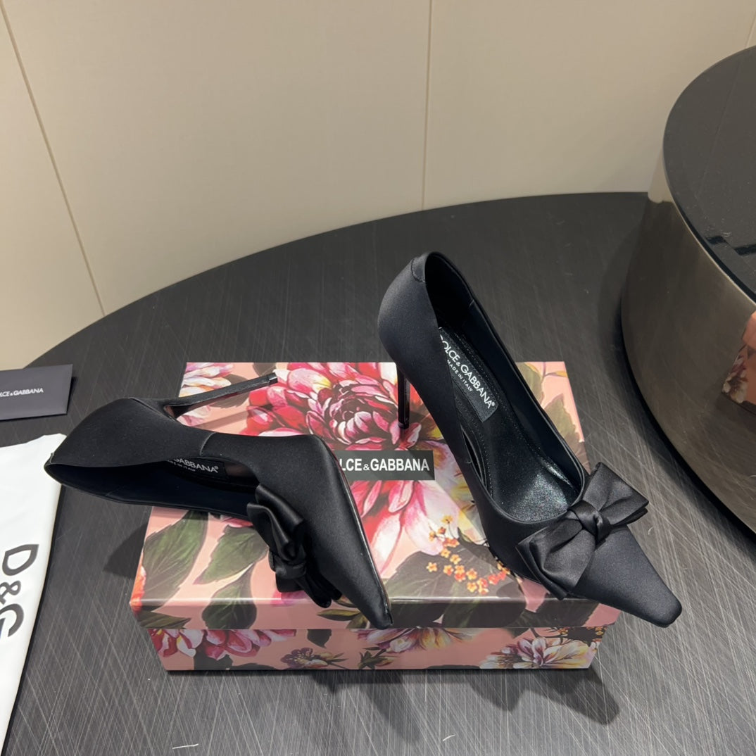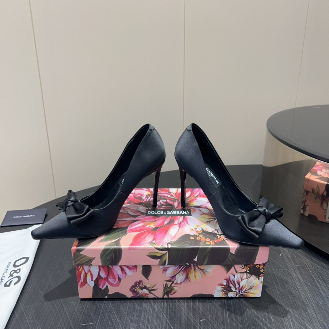 DC 25 Toe Bow High Heel Shoes 100mm Black Silk And Sheepskin 381609