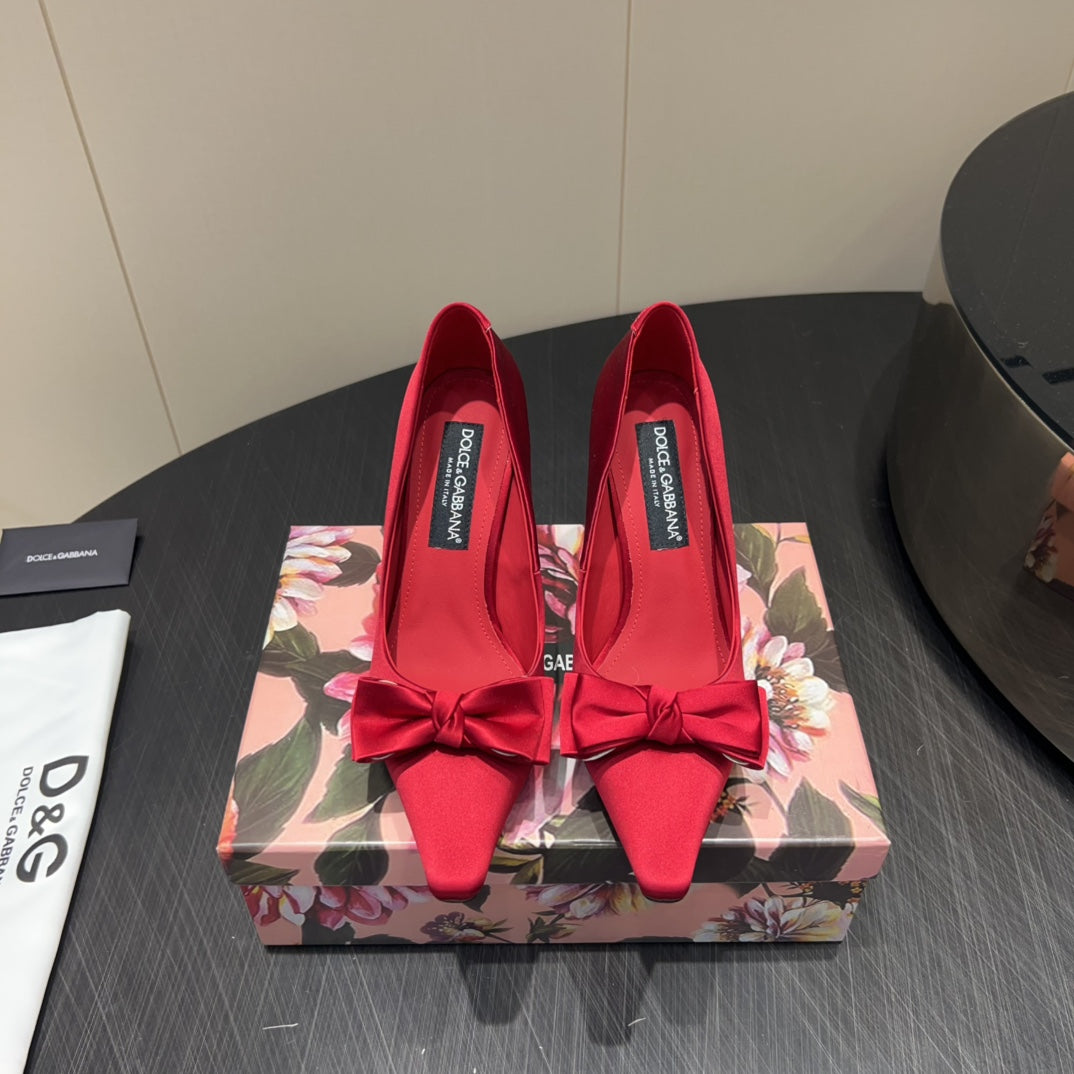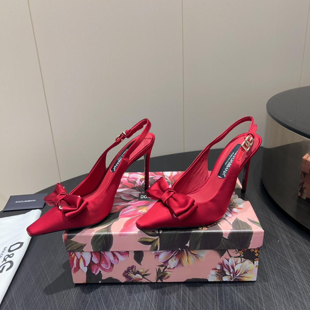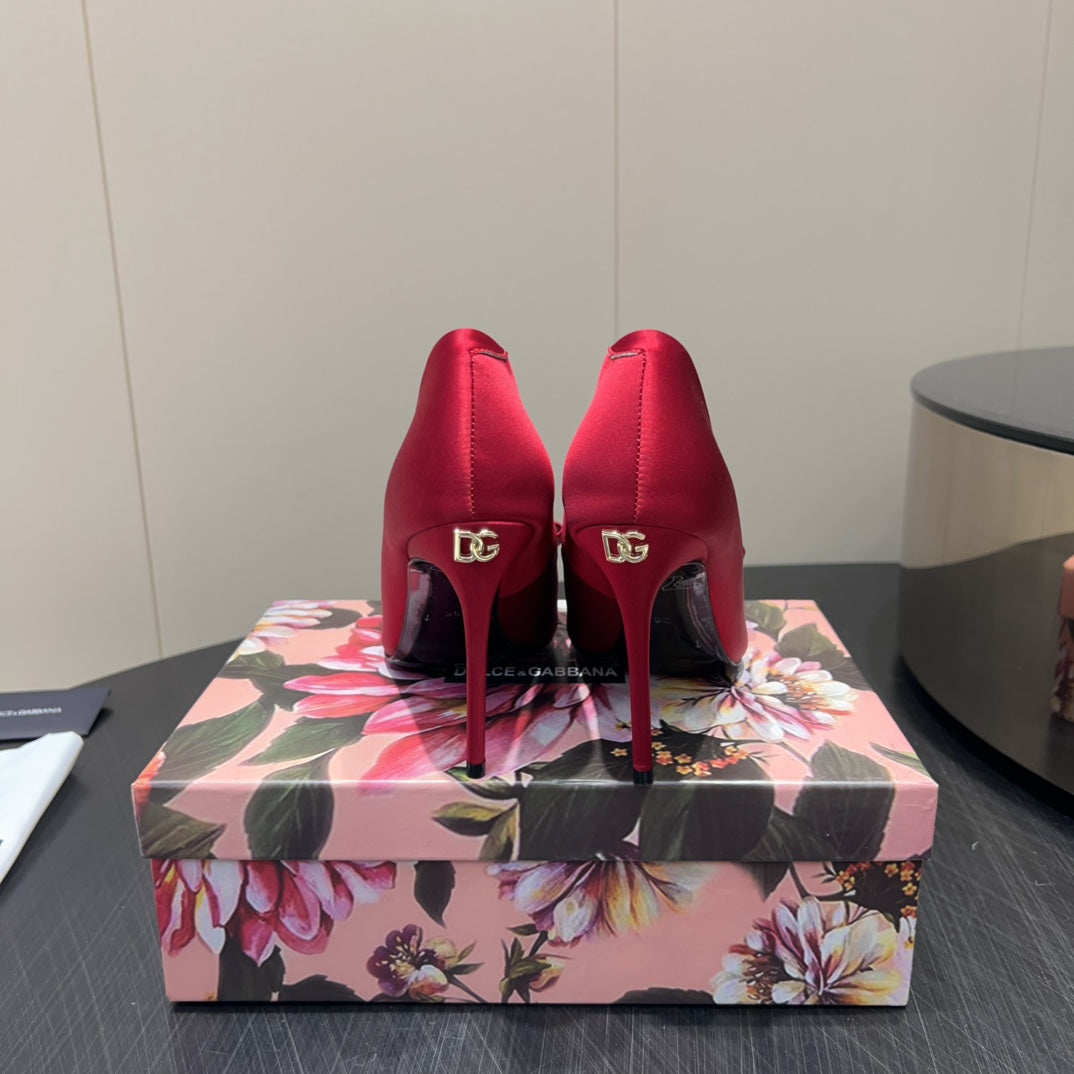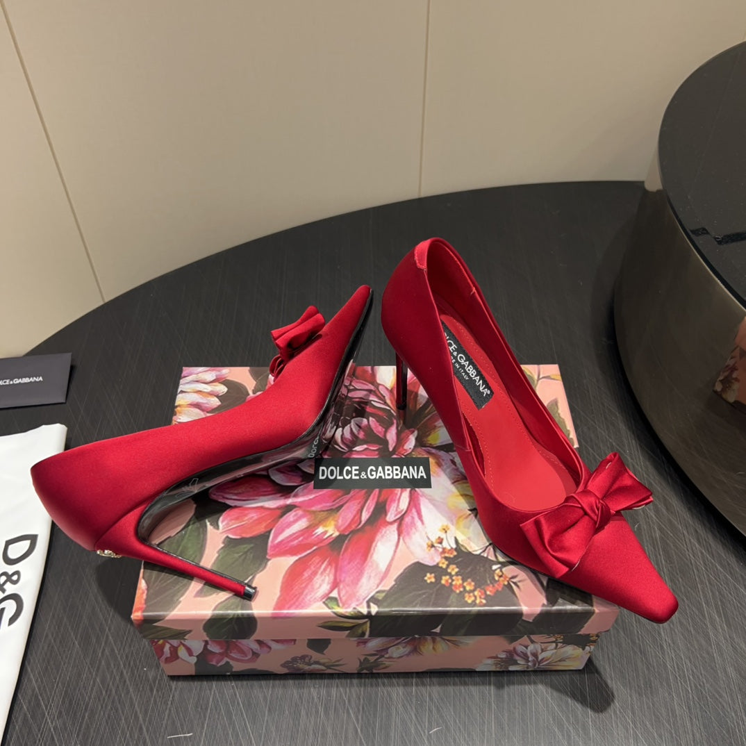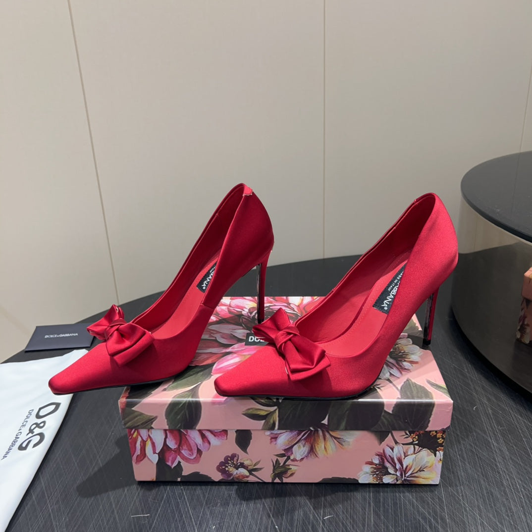 DC 25 Toe Bow High Heel Shoes 100mm Red Silk And Sheepskin 381610