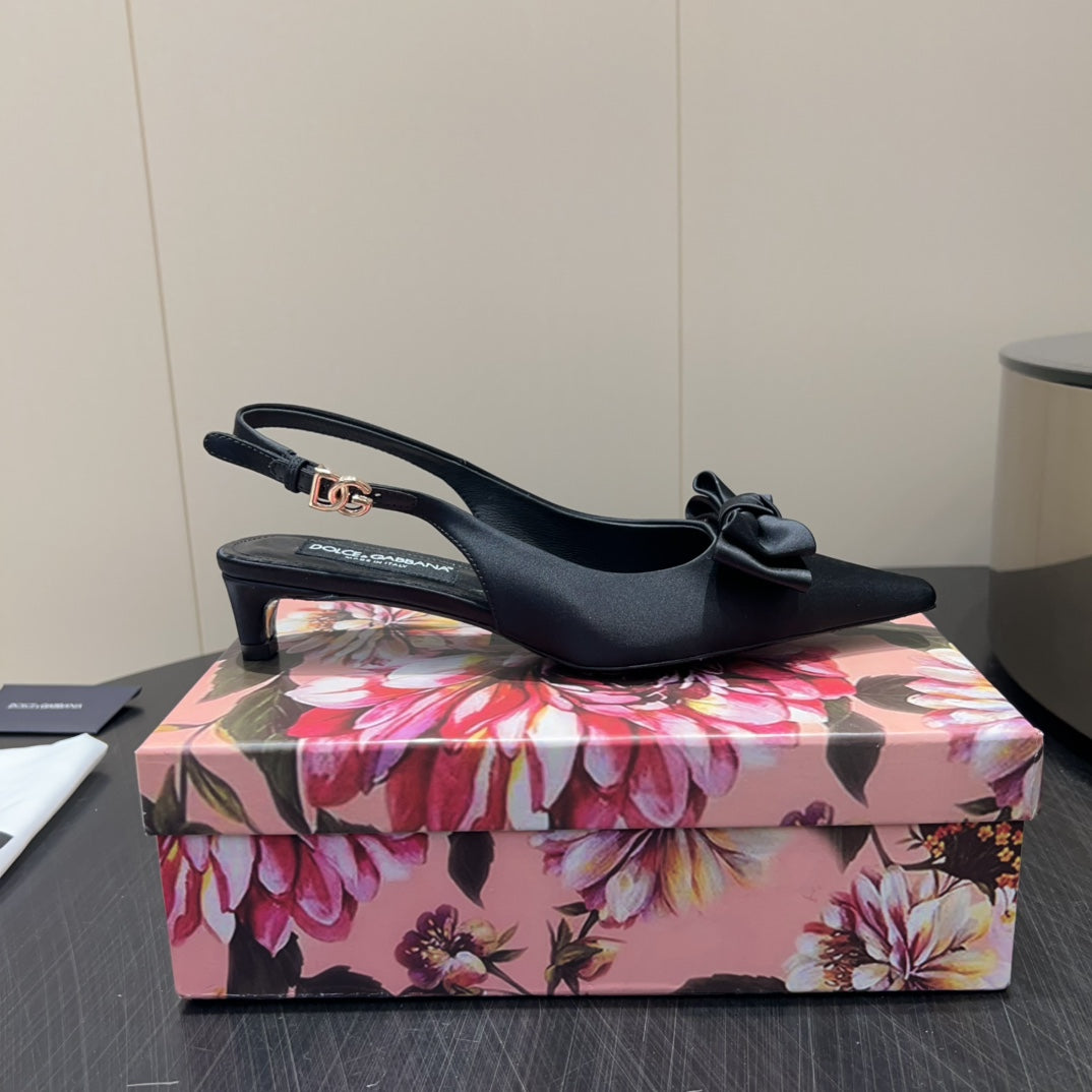 DC Bow Slingback Pumps 30mm Black Satin & Sheepskin 359511