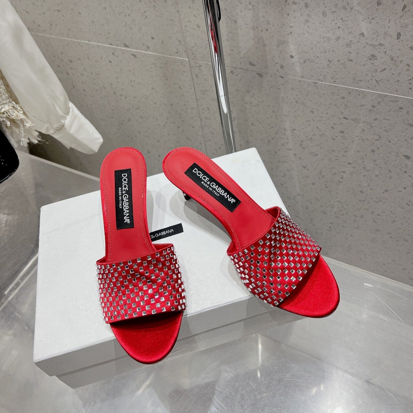 DC Rhinestone Mules 65mm Red Silk & Sheepskin 359515