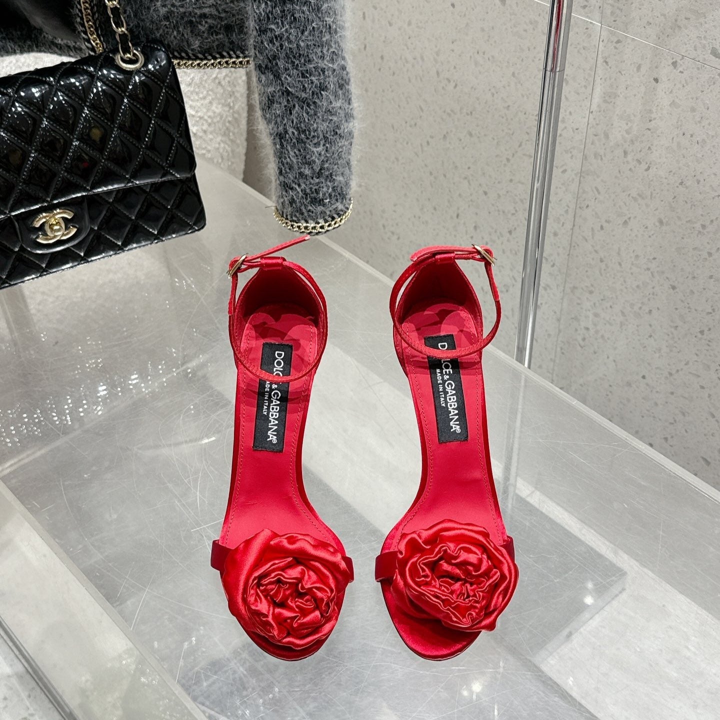 DC Flower High Heel Sandals 105mm Red Satin & Sheepskin 359506