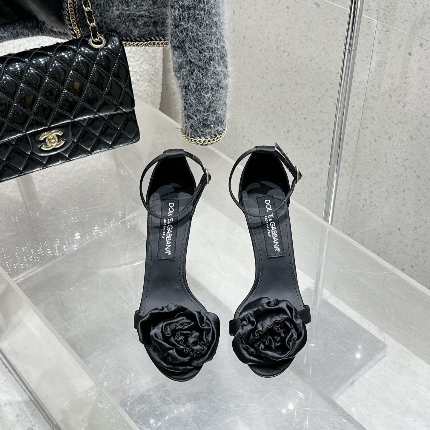 DC Flower High Heel Sandals 105mm Black Satin & Sheepskin 359507