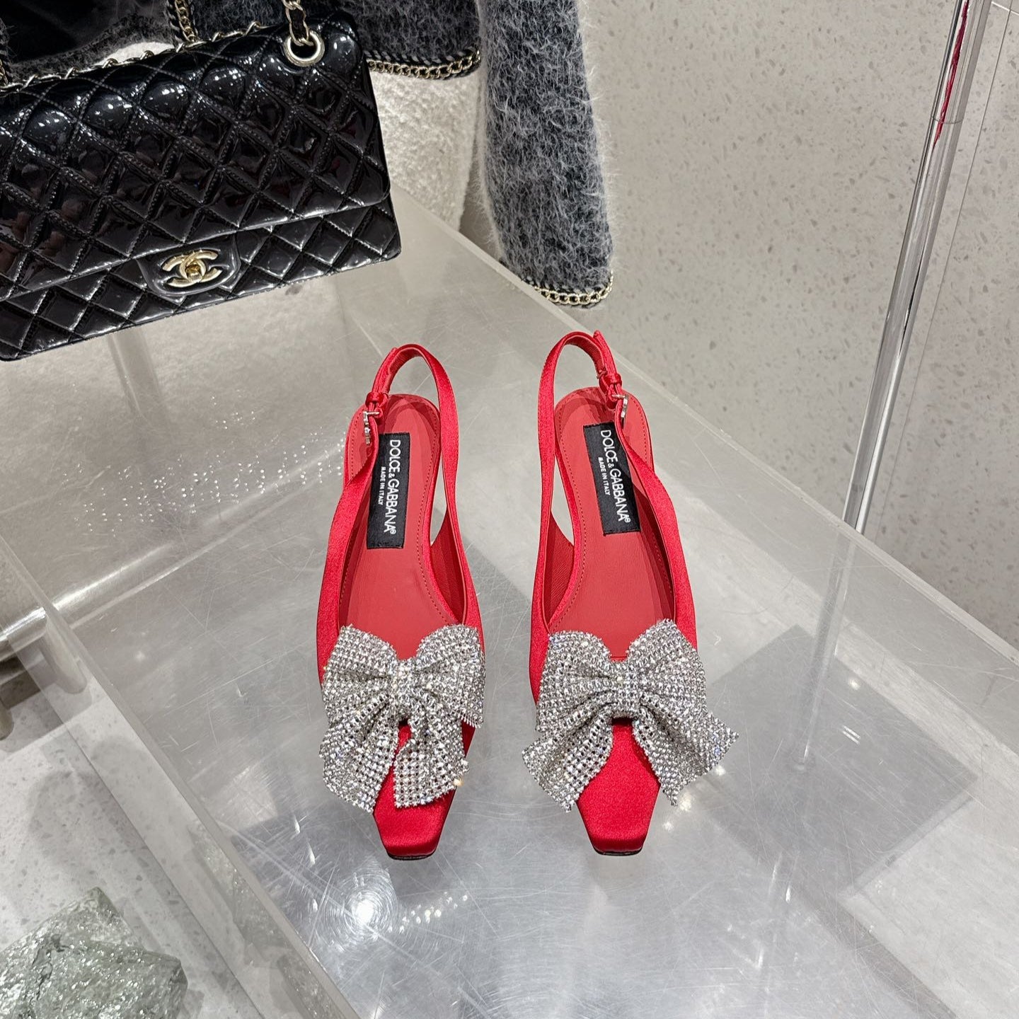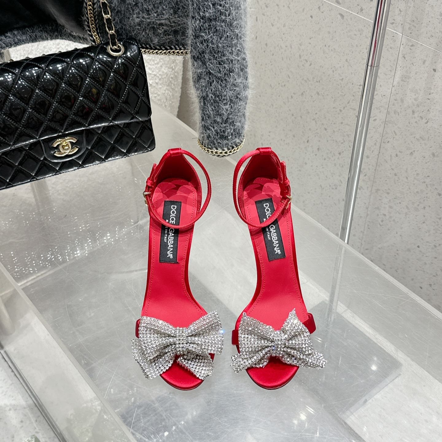 DC Rhinestone Bow Heel Sandals 105mm Red Satin & Sheepskin 359508