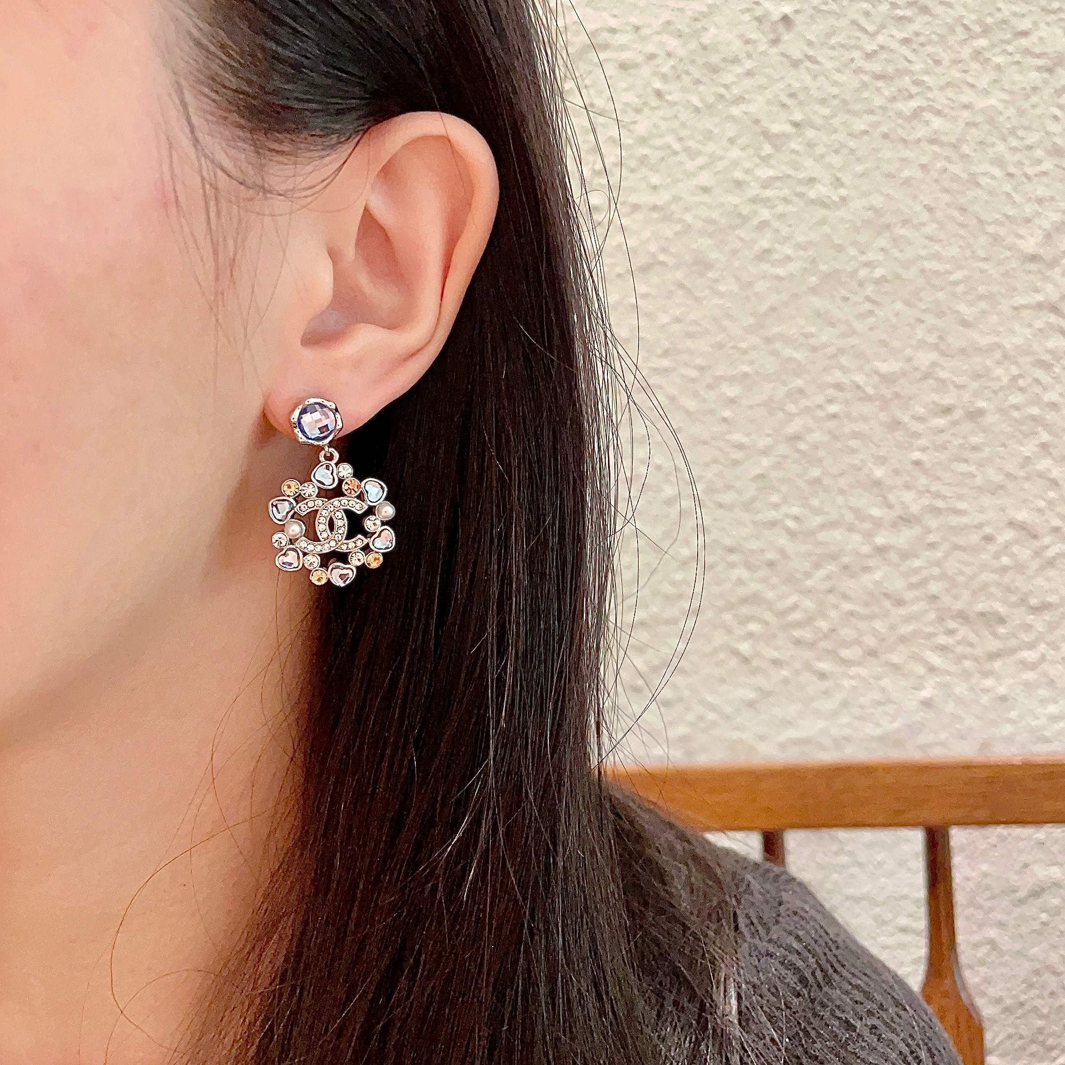 DOUBLE C STUD EARRINGS IN SILVER METAL WHITE PEARL GOLD AND BLUE STONES