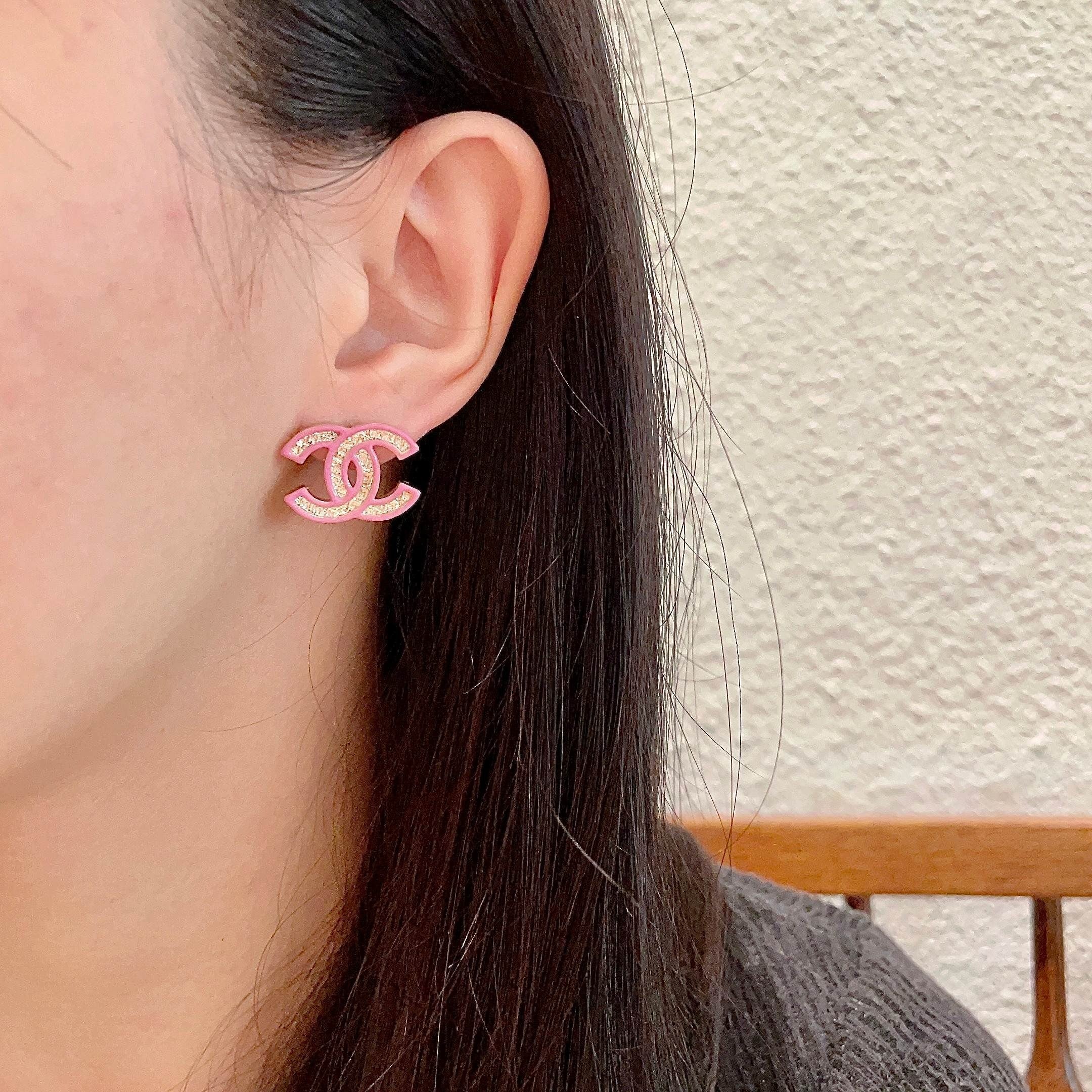 DOUBLE C STUD EARRINGS WITH PINK TRIM AND CENTER STONE