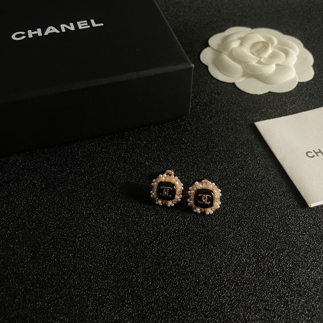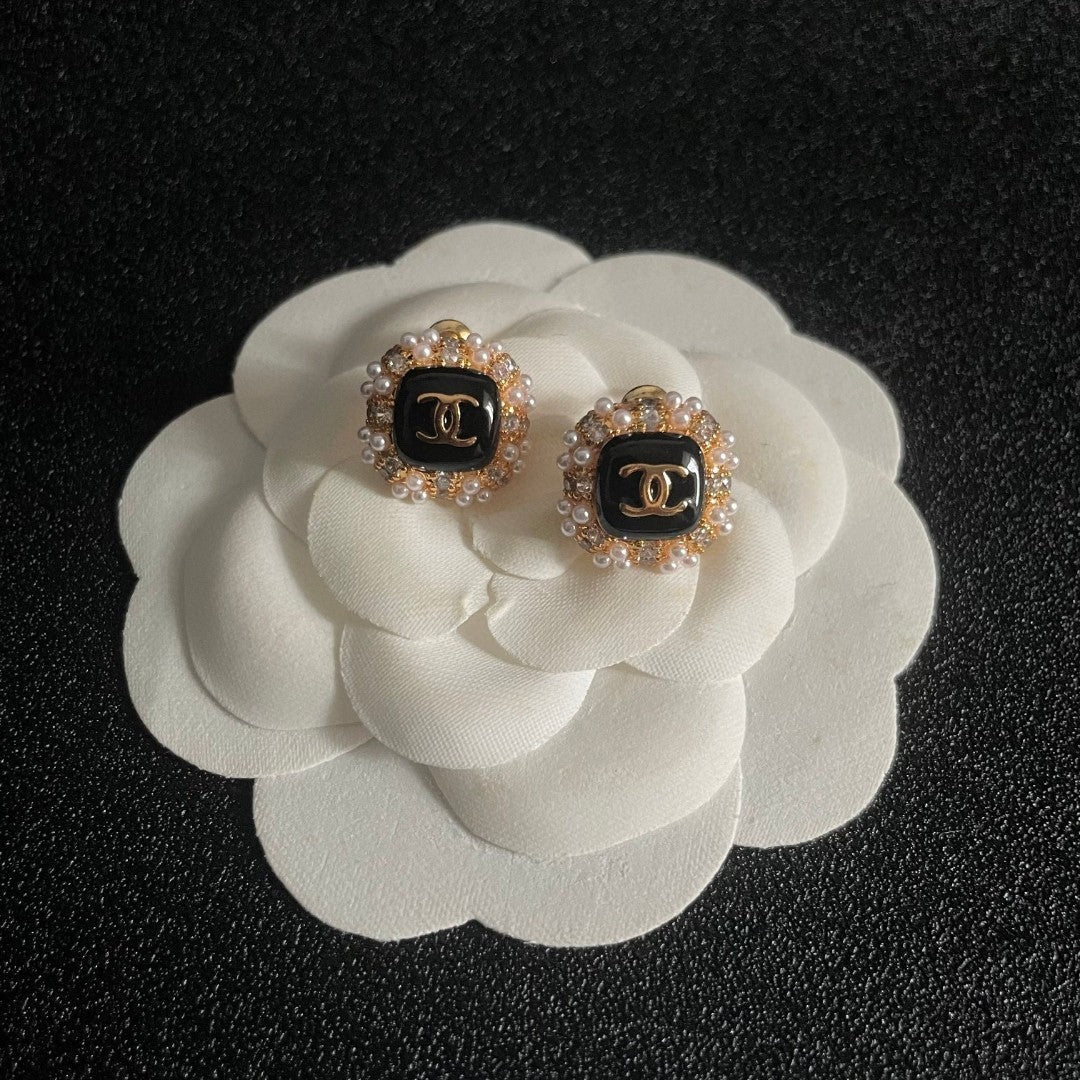 STUD EARRINGS SQUARE DOUBLE C IN GOLD METAL WHITE PEARL BLACK ENAMEL