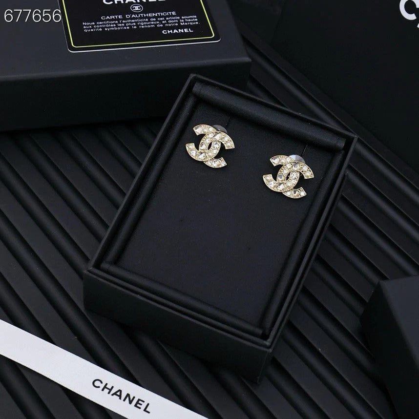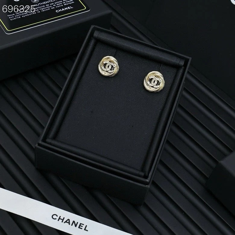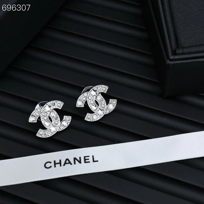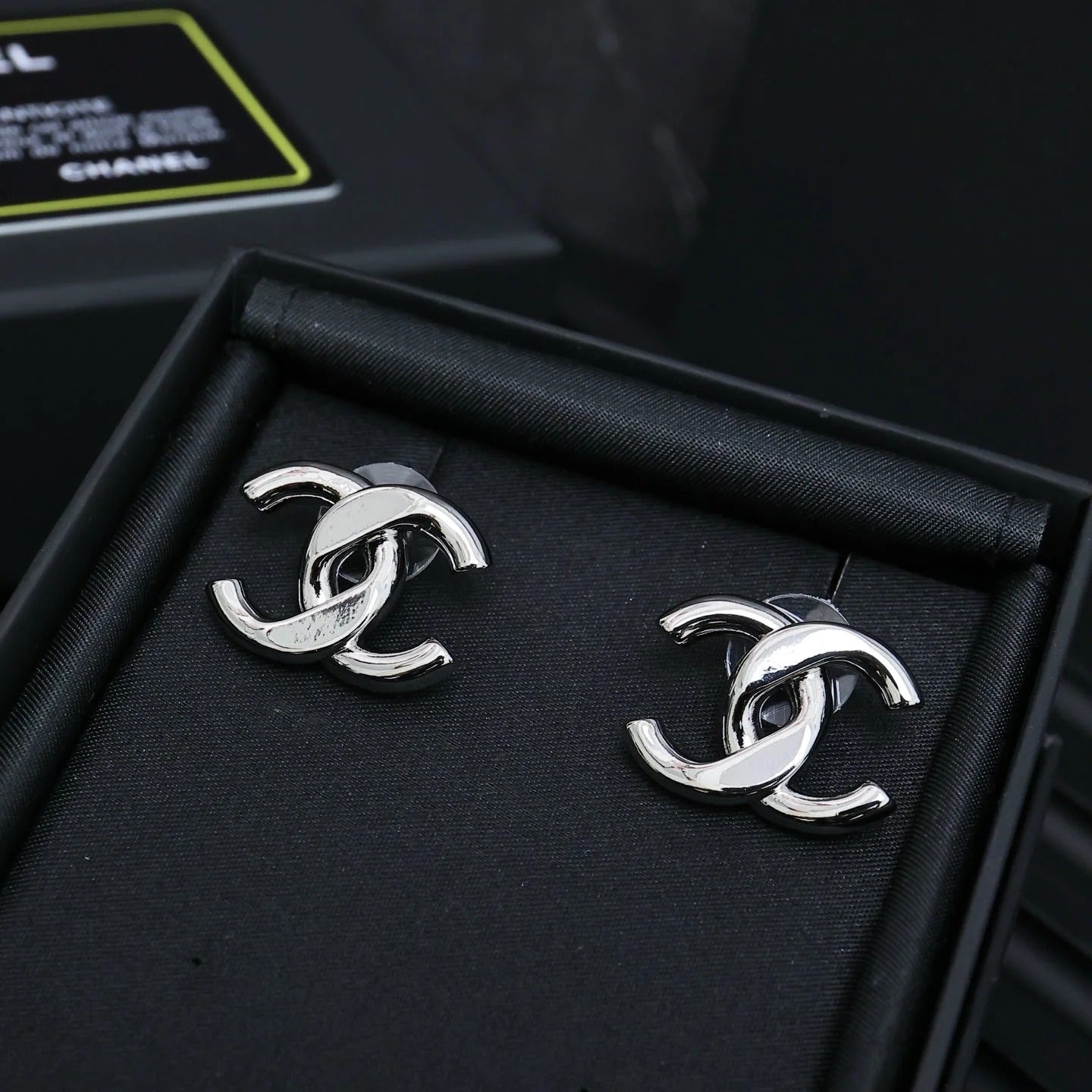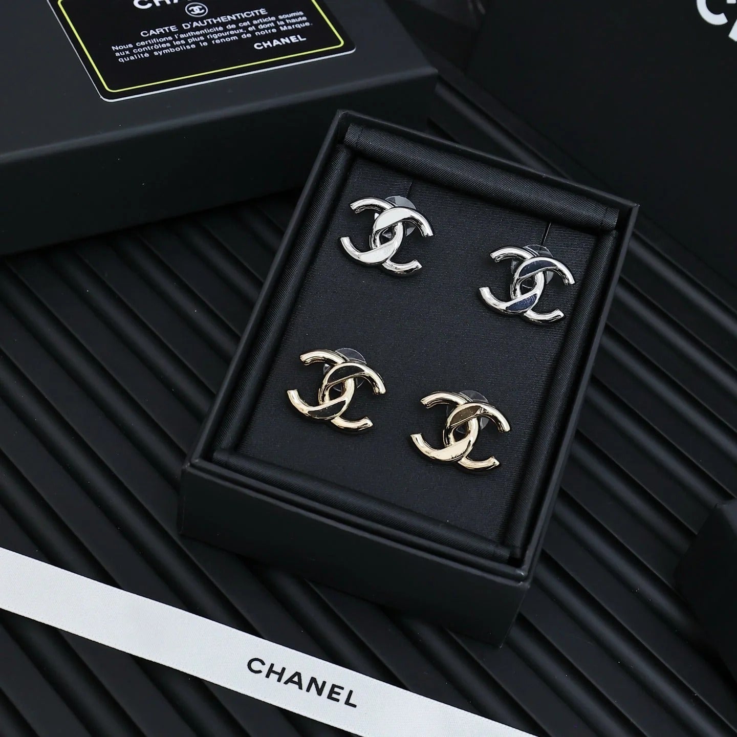 DOUBLE C STUD EARRINGS WITH WHITE TRIM AND CLEAR STONE LOGO