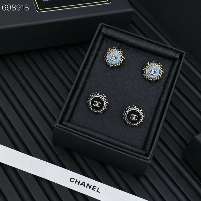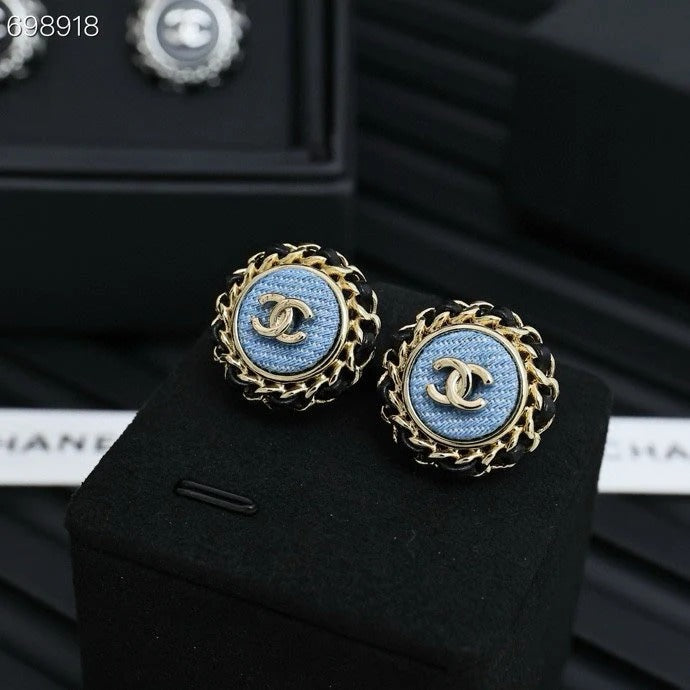 CC 25P STUD EARRINGS IN BLUE DENIM BLACK CALFSKIN-THREADED BUTTON
