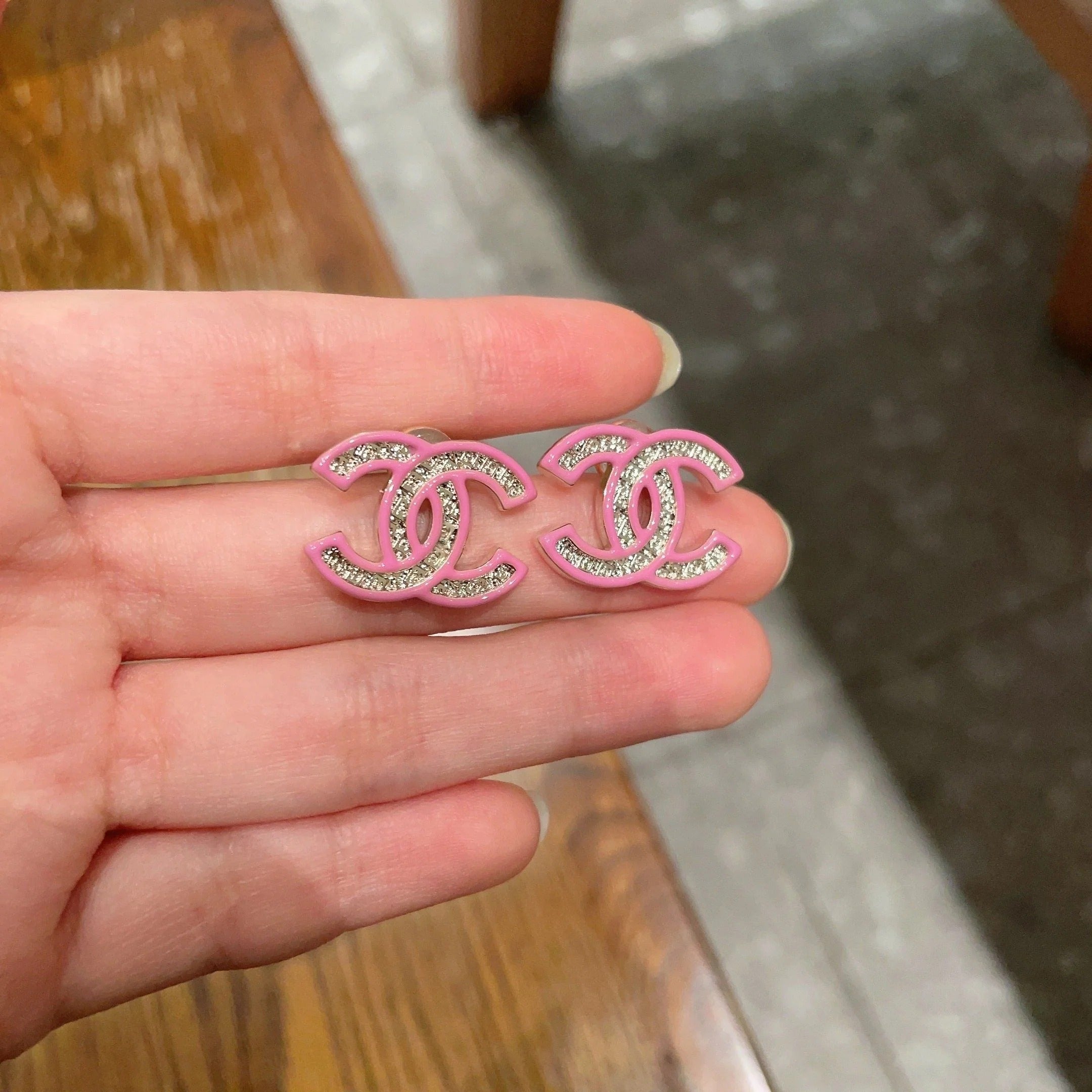 DOUBLE C STUD EARRINGS WITH PINK TRIM AND CENTER STONE