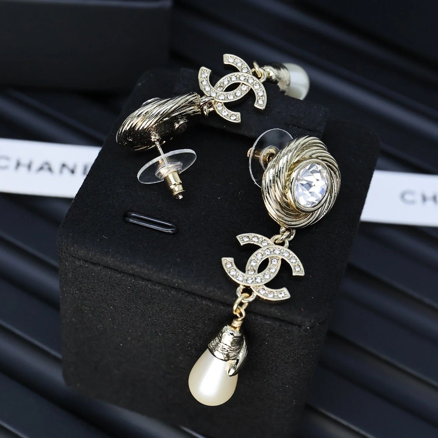 PENDANT EARRINGS IN GOLD METAL WHITE CRYSTAL TWISTED RIBBED DOUBLE C
