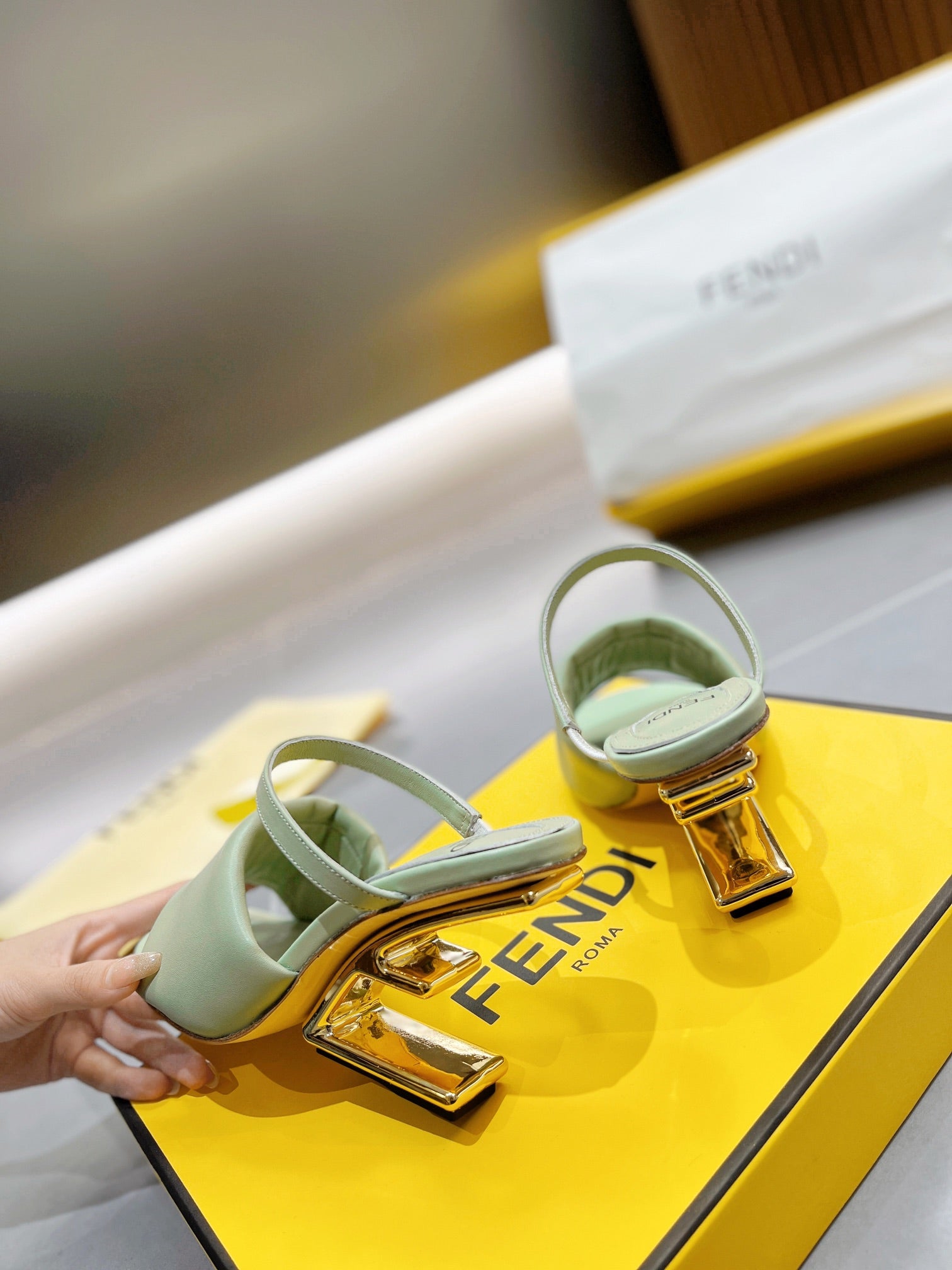 FENDI BAGUETTE HIGH-HEEL SANDALS 8 CM IN MINT GREEN CALFSKIN