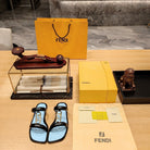 FENDI O'LOCK SLIDES BLACK AND LIGHT BLUE CALFSKIN WITH GOLD HARDWARE