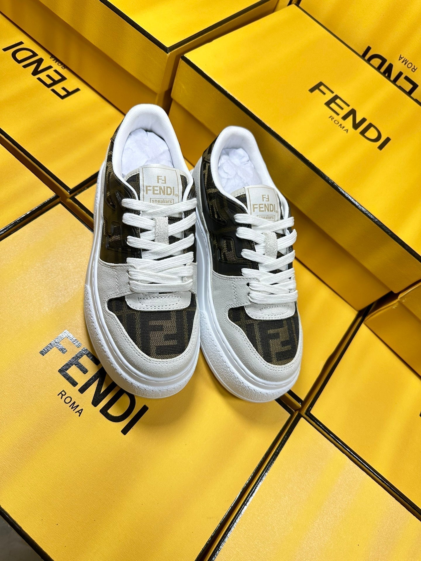 FENDI THICK-SOLDED SNEAKER IN WHITE SUEDE AND BROWN MONOGRAM FABRIC