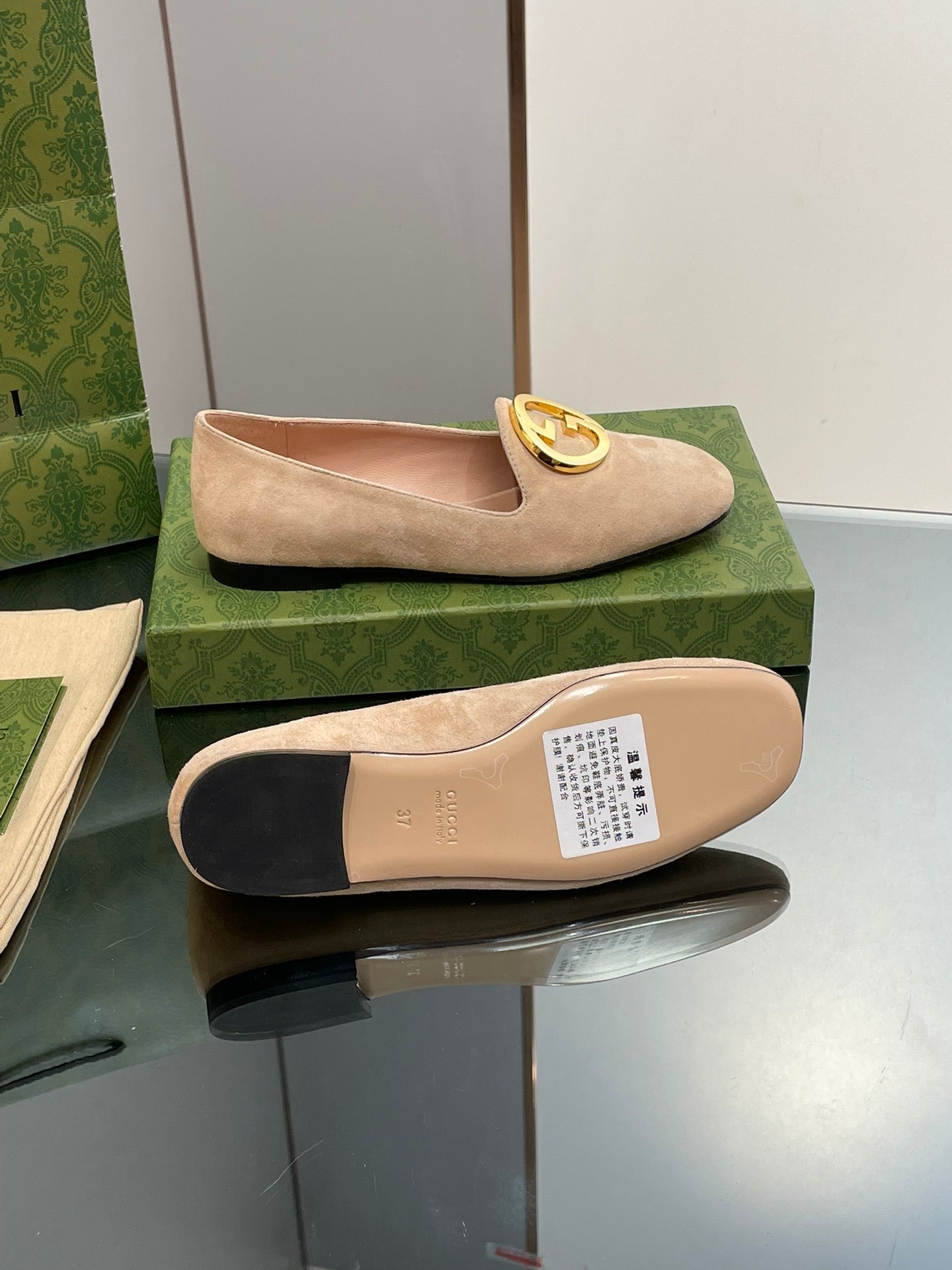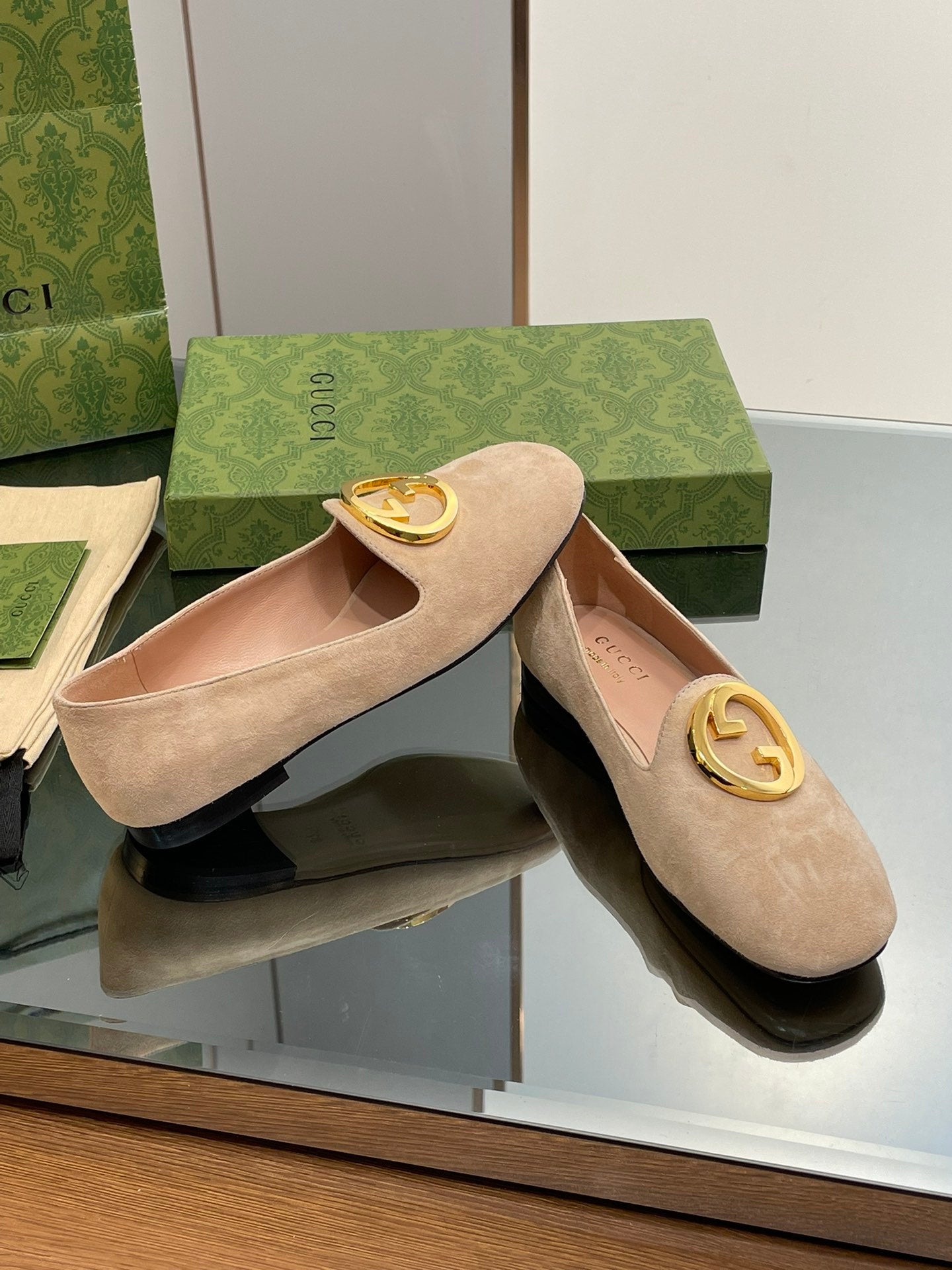 BLONDIE LOGO-PLAQUE LOAFERS IN ECRU BEIGE SUEDE