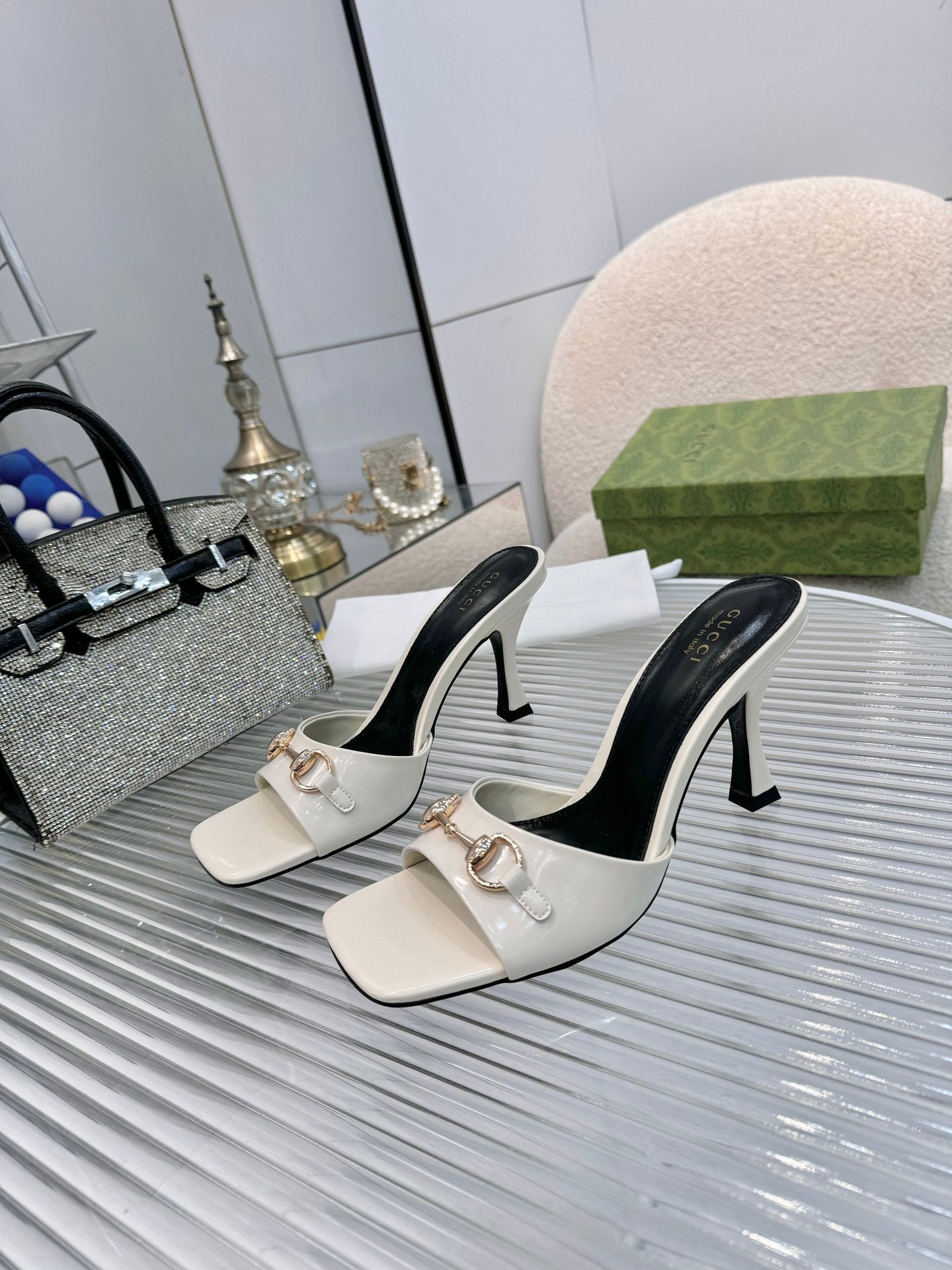 GG Gold Buckle Slide Sandal 80mm White Patent Leather 457562
