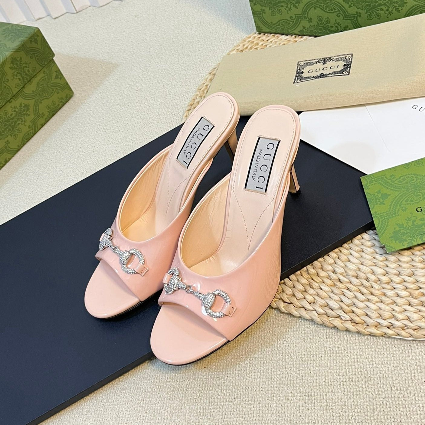 GG Women's Horsebit mid-heel slide sandal in glossy Rose Pink