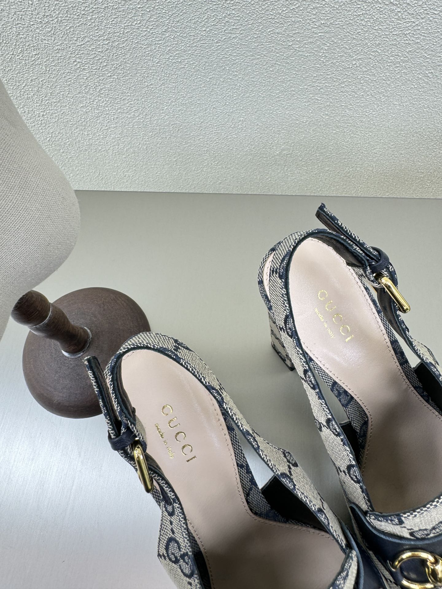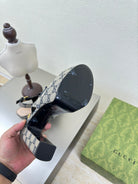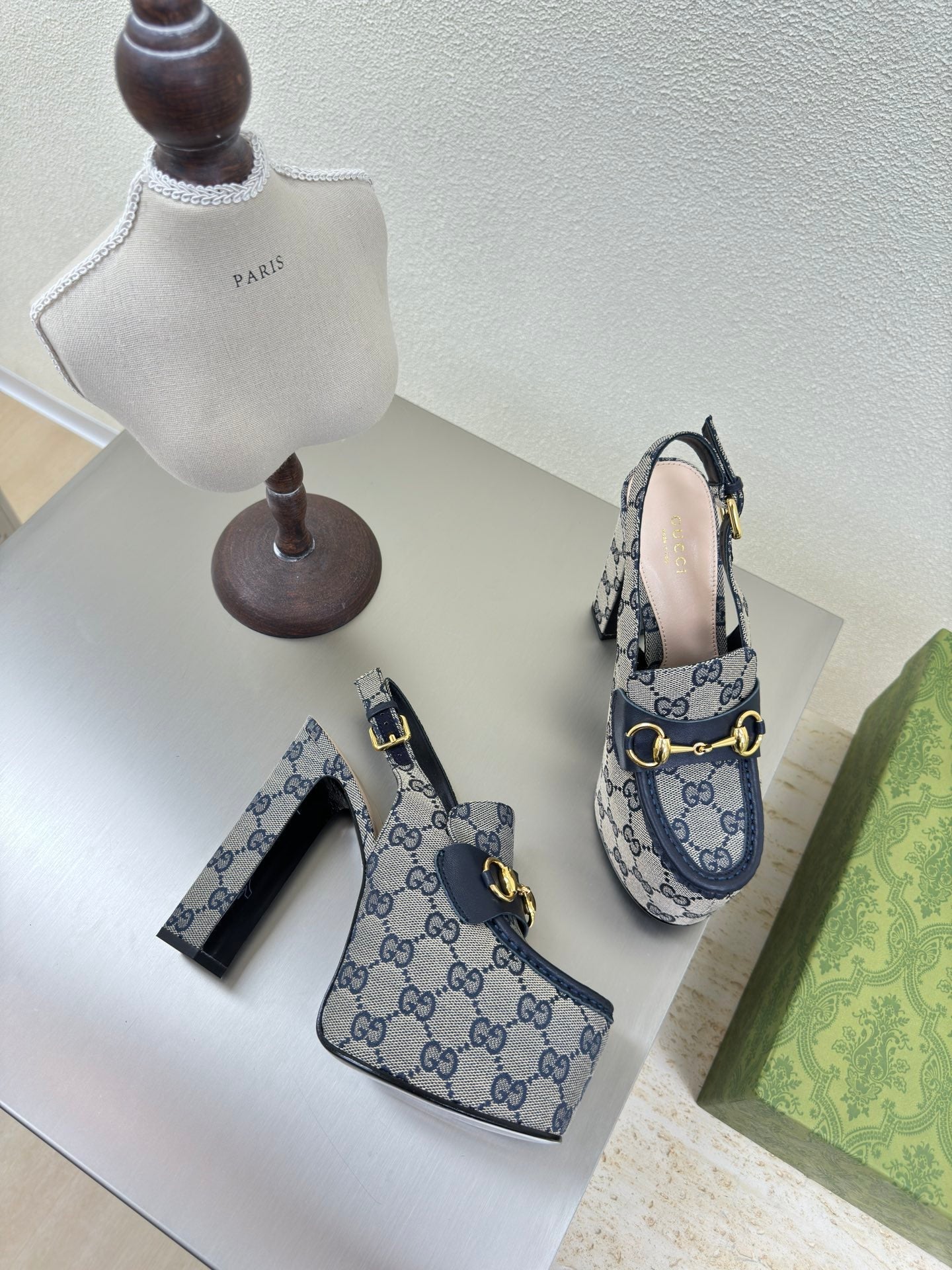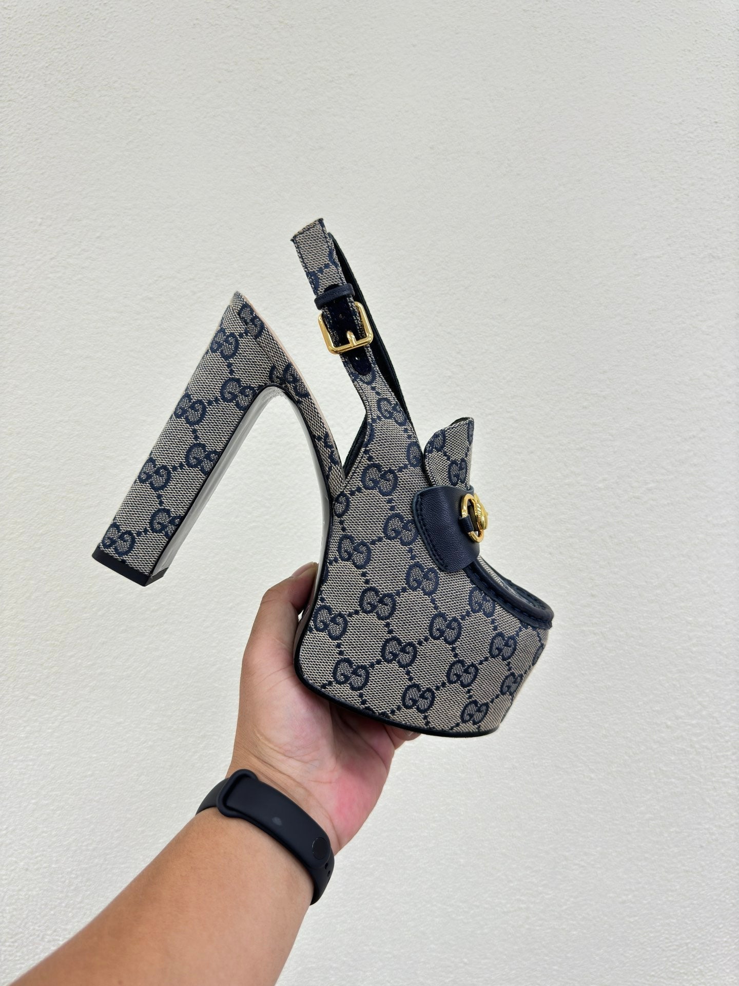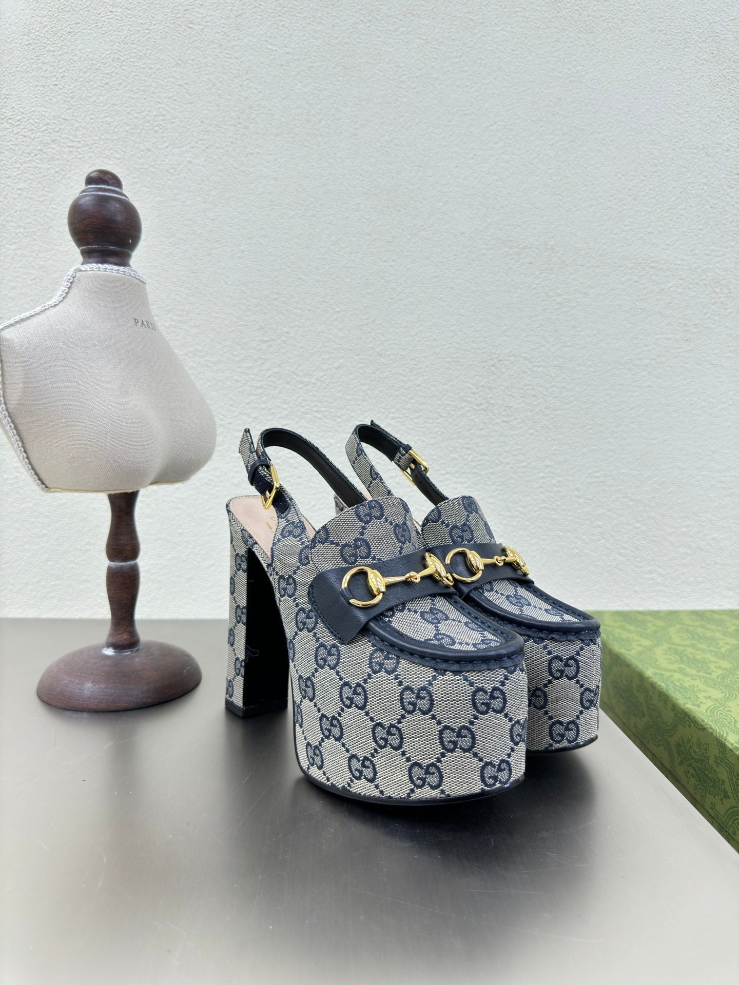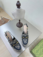 GG WOMEN'S HORSEBIT PLATFORM LOAFER SLINGBACK IN BEIGE AND BLUE CANVAS