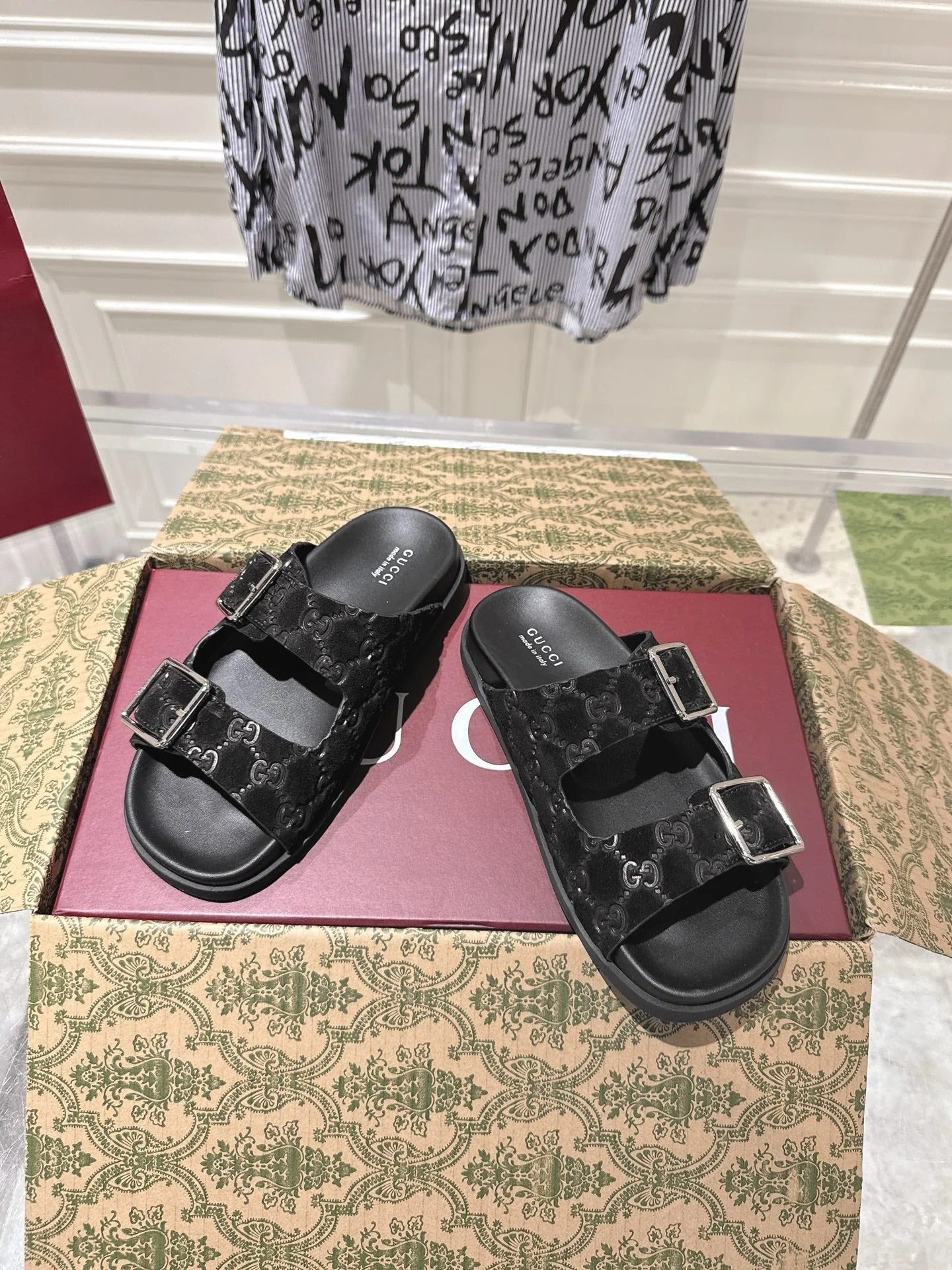 SANDALS IN BLACK SUEDE EMBOSSED LOGO SILVER HARDWARE