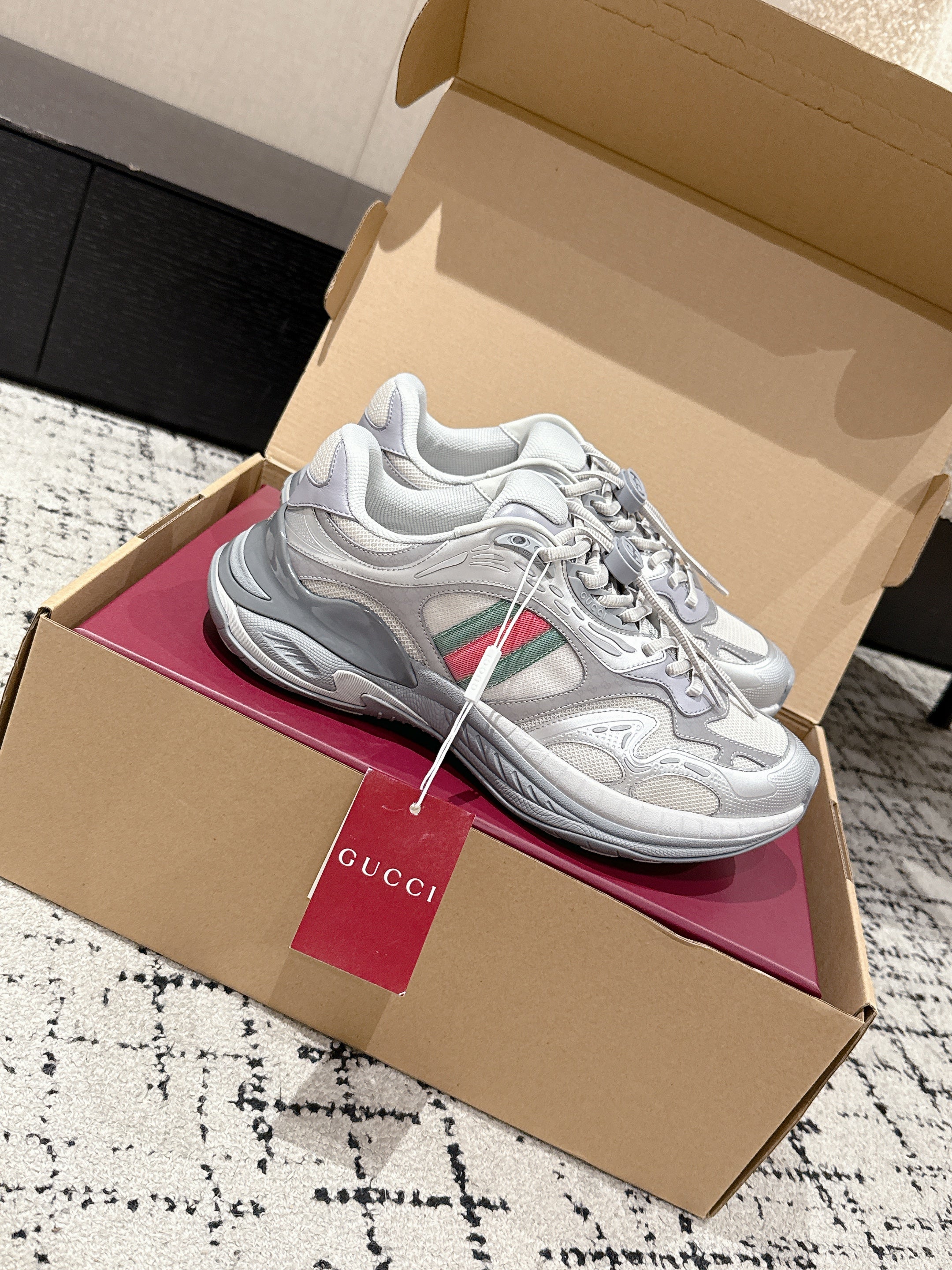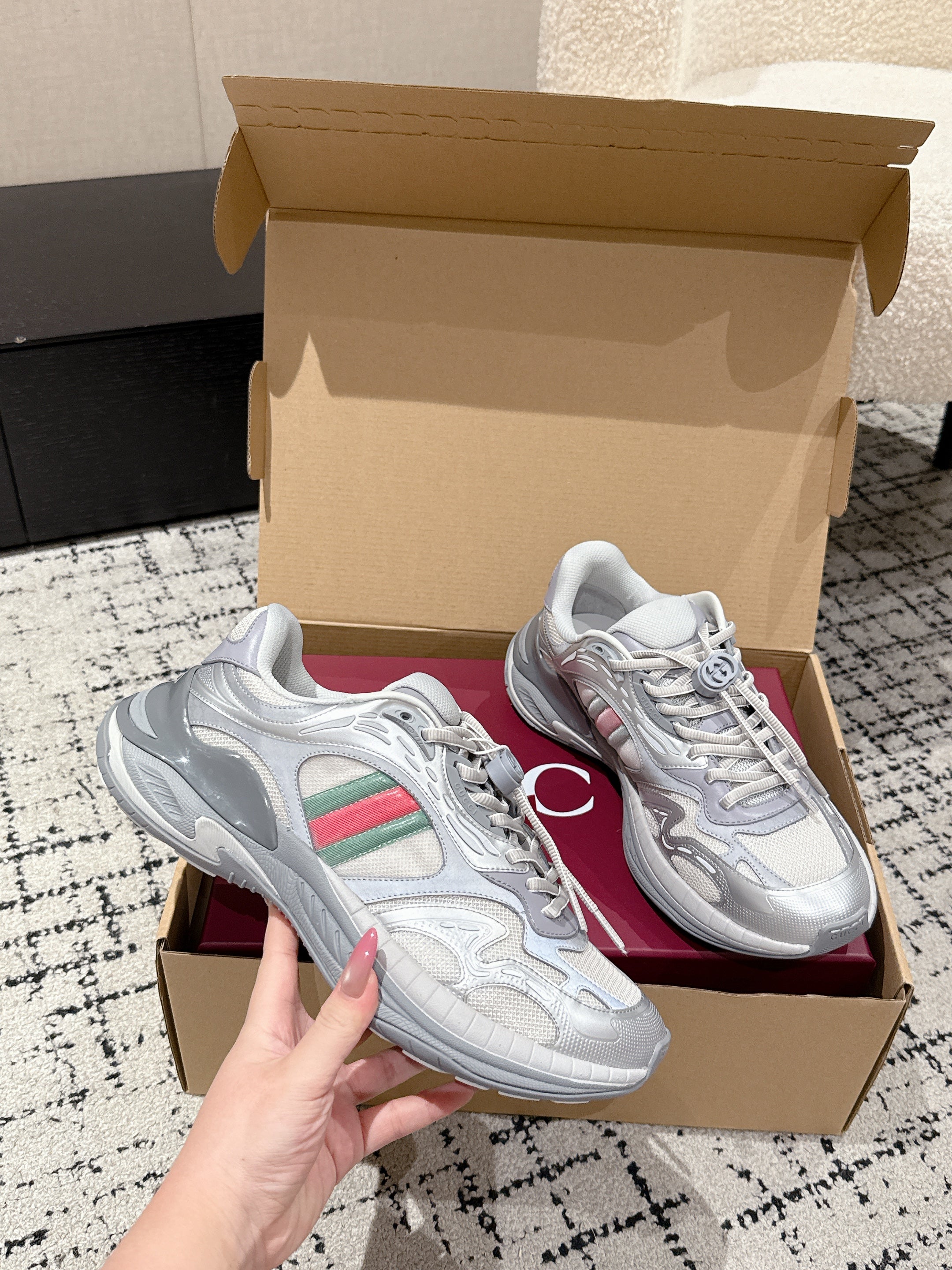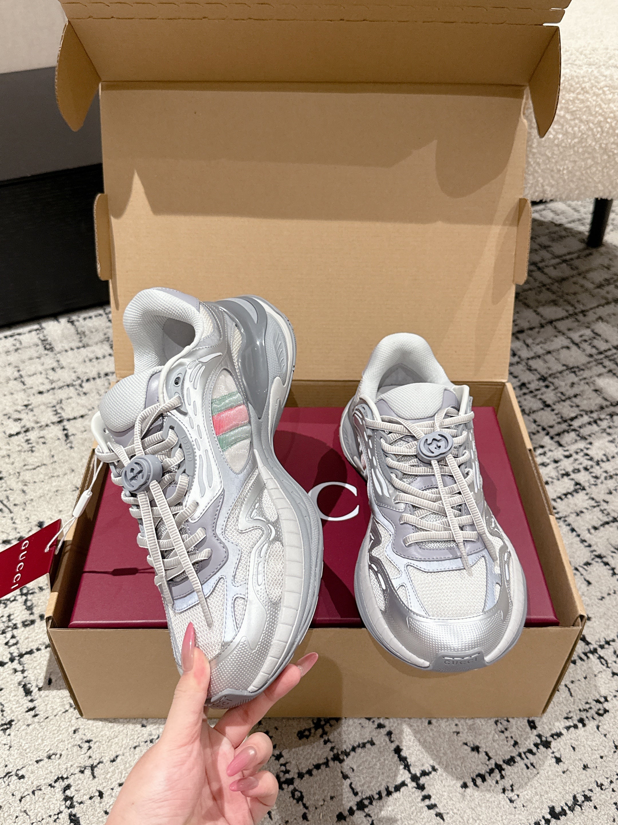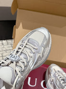 GG Rhyton Leather Sneakers White and Silver Leather 514914