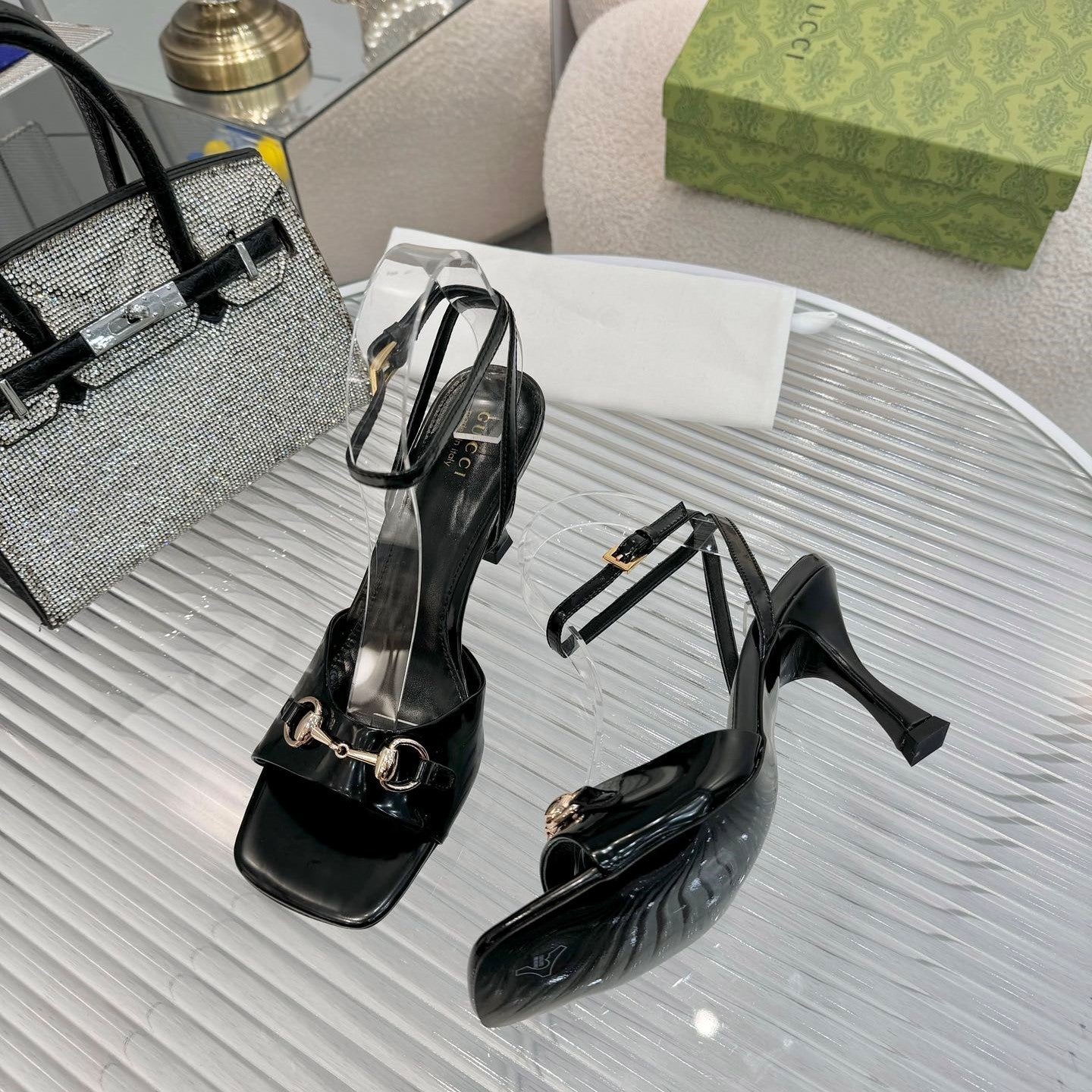 GG Gold Buckle Sandal 80mm Black Patent Leather 457555