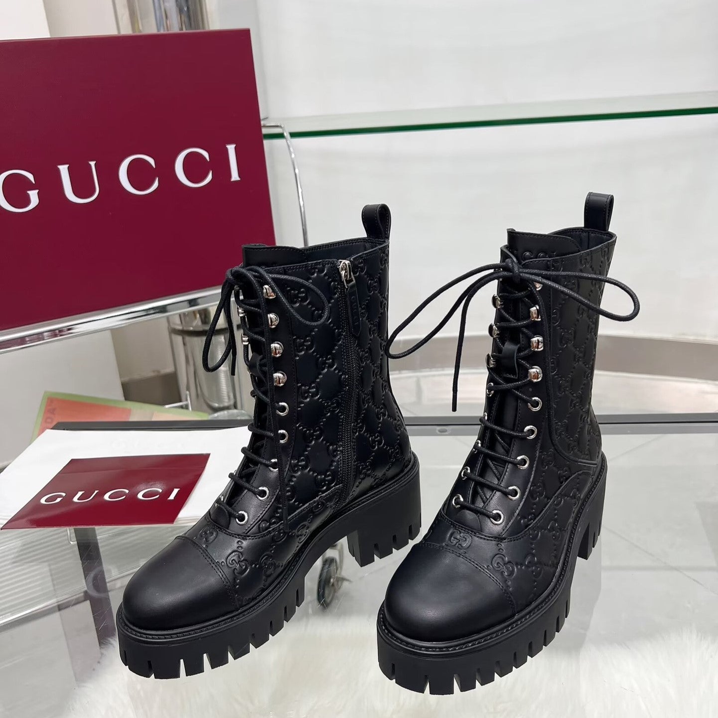 GG Platform Combat Boots Black Logo Embossed Cowhide 476791