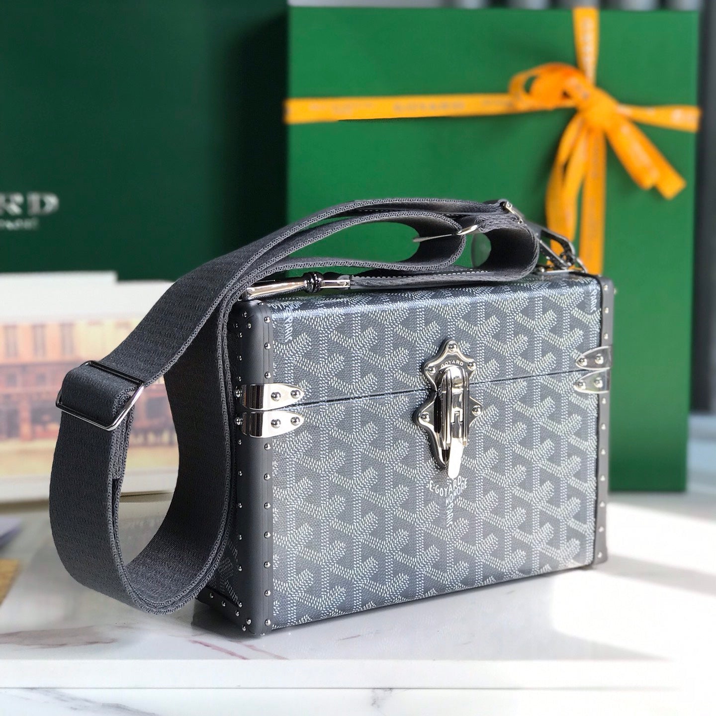 CASSETTE TRUNK BAG 21 IN GREY GOYARDINE CANVAS & CLAMECY COWHIDE