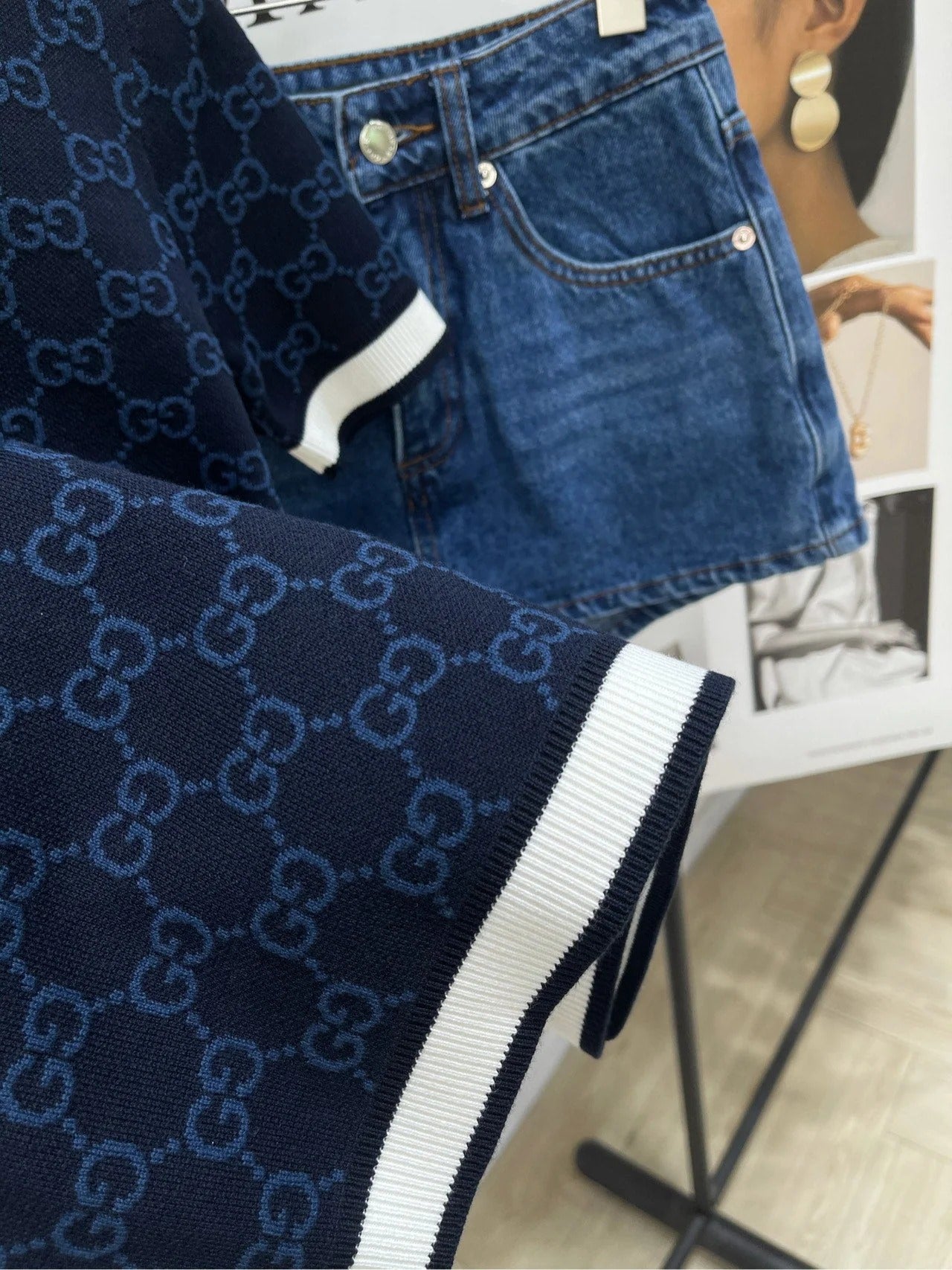 GUCCI SHORT-SLEEVE CREW NECK KNIT TOP WITH WHITE TRIM 256819