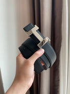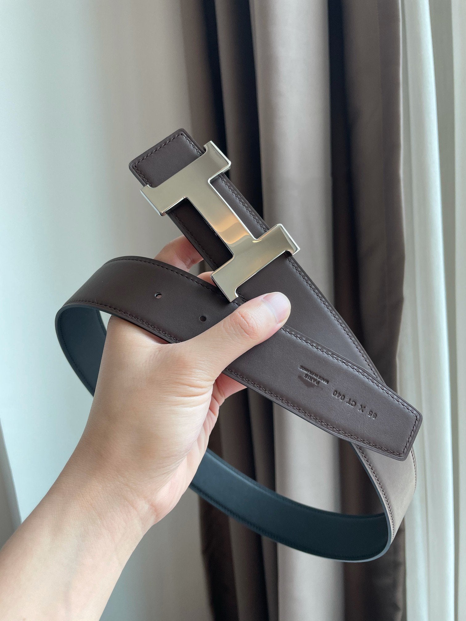 H CONSTANCE BELT 38MM SILVER BUCKLE BLACK CHOCOLATE LEATHER