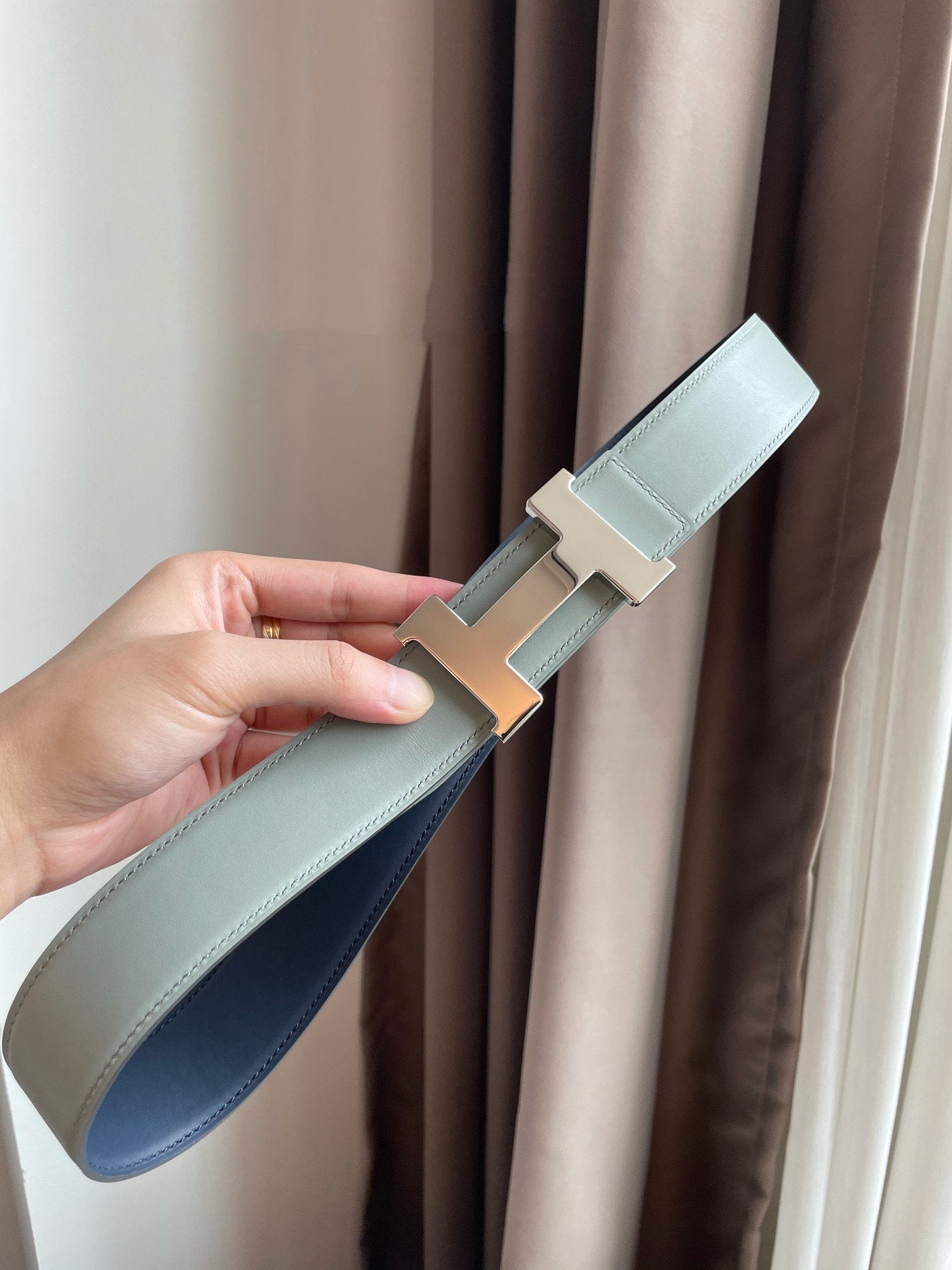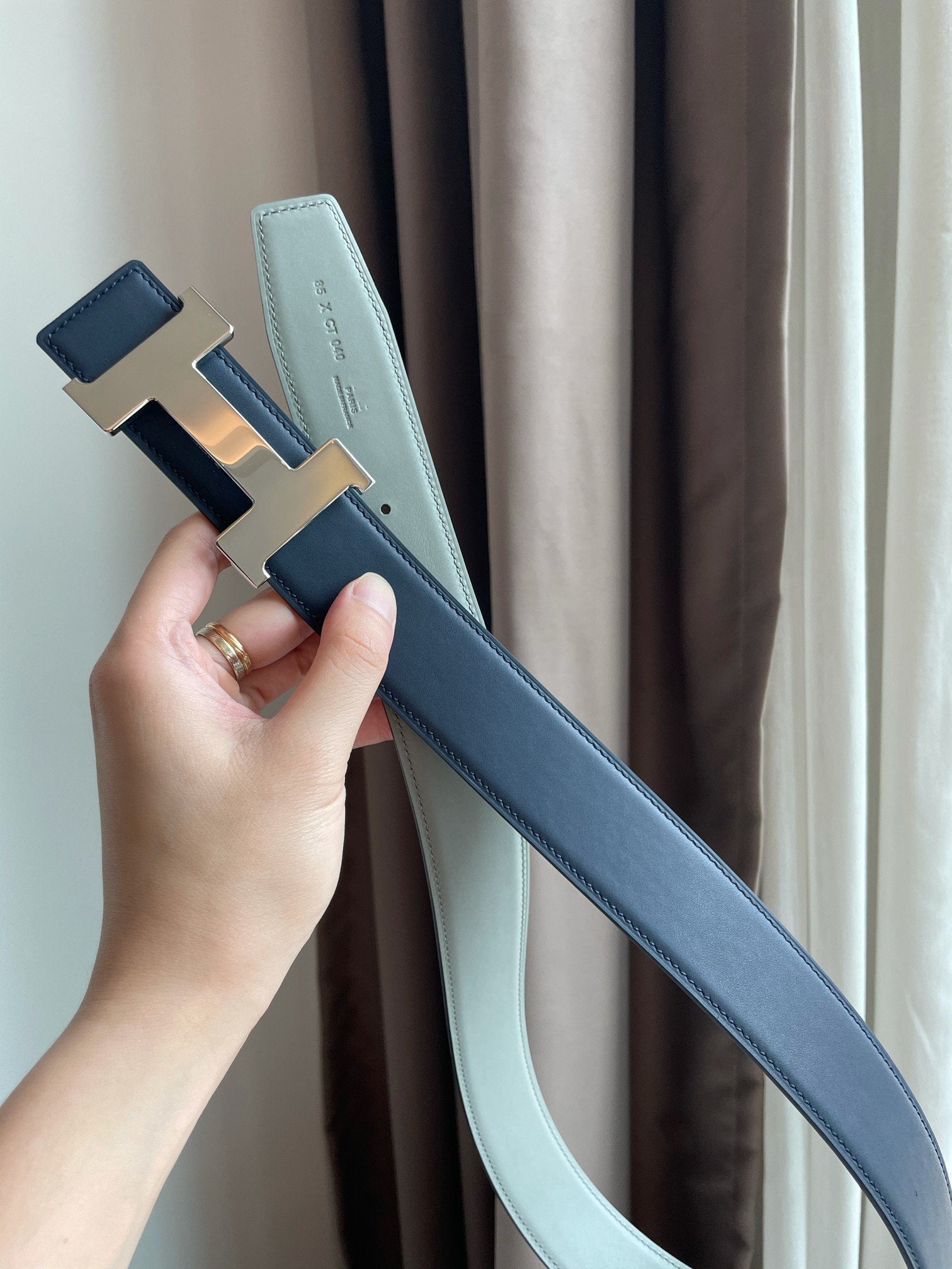 • H Buckle in permabrass plated metal.