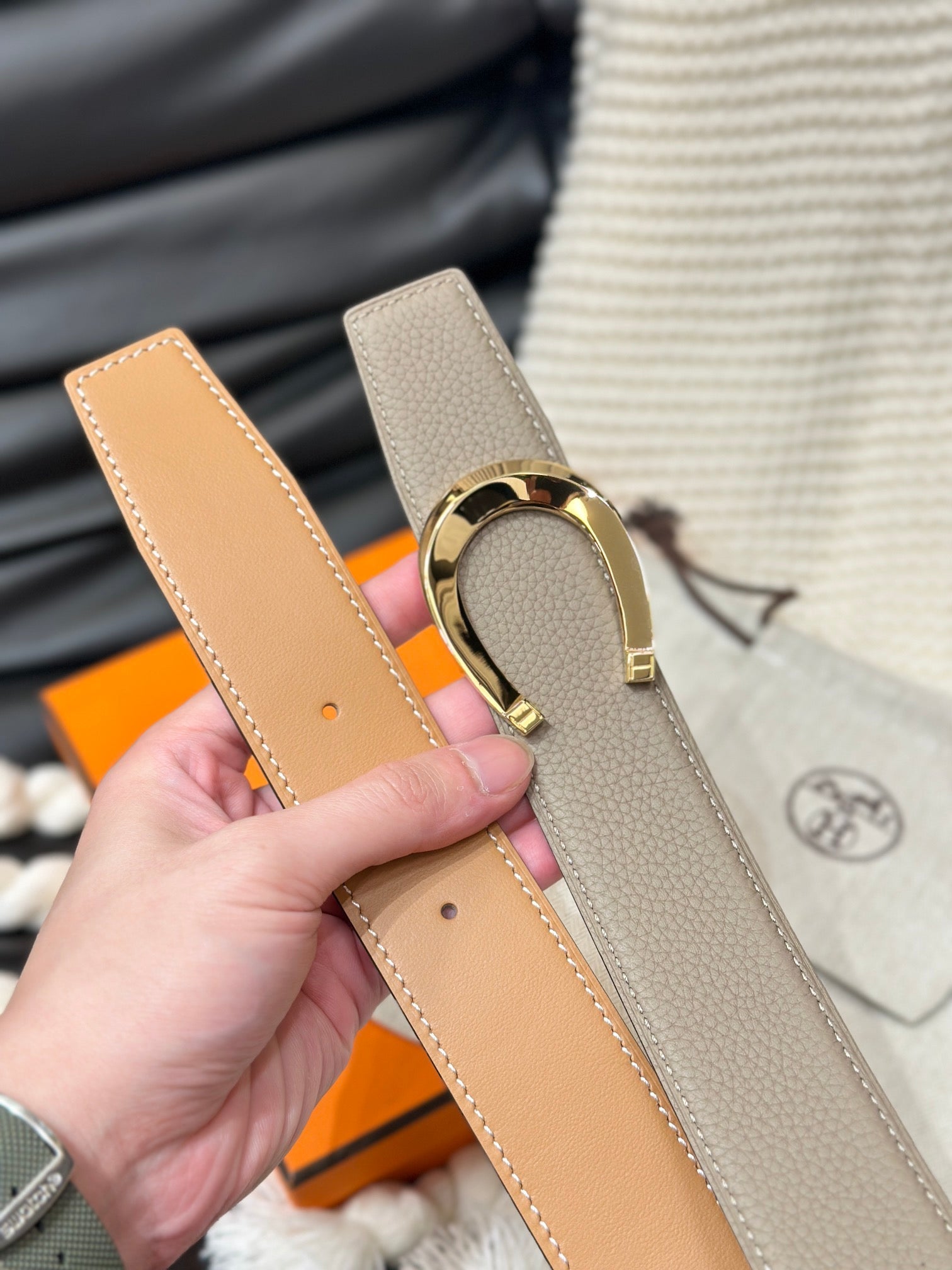 HM LUCK BELT GOLD BUCKLE & REVERSIBLE PEANUT BROWN LEATHER STRAP 38MM