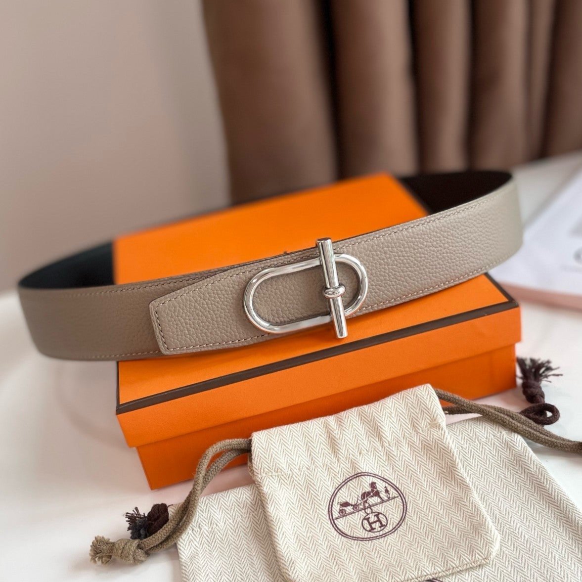 TUBE H BELT BUCKLE & REVERSIBLE KHAKI BROWN AND BLACK LEATHER STRAP 38MM SILVER HARDWARE