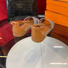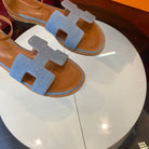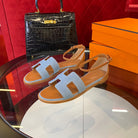 - Material: Sandal in Clafskin with straight cut edges, "H" cut-out detail and thin ankle strap.