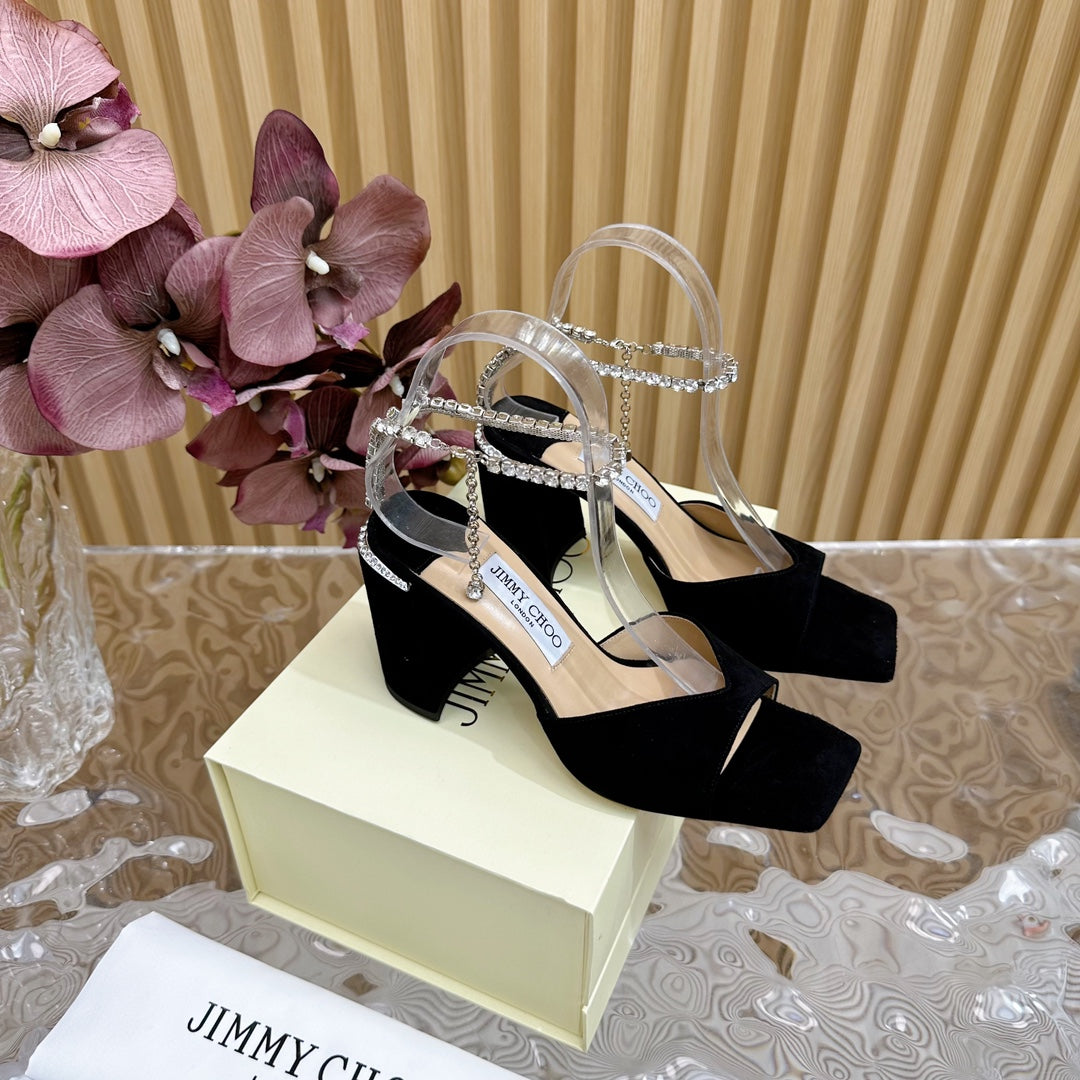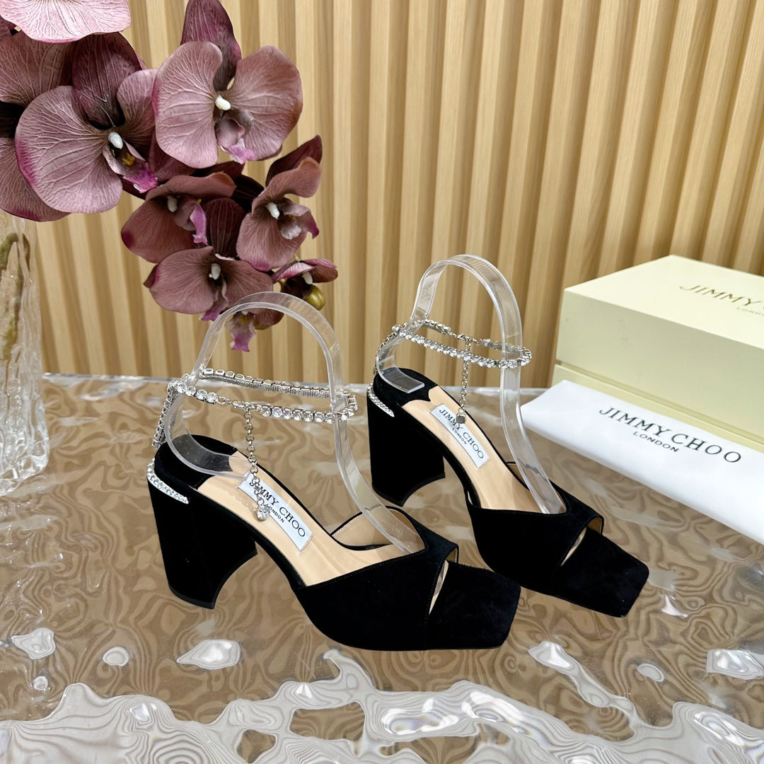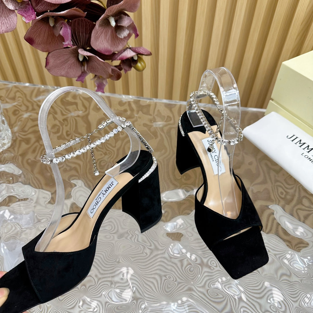 Saeda Sandal Block Heel 85 Black Suede Leather Block Heel Sandals with Crystal Chain 691673