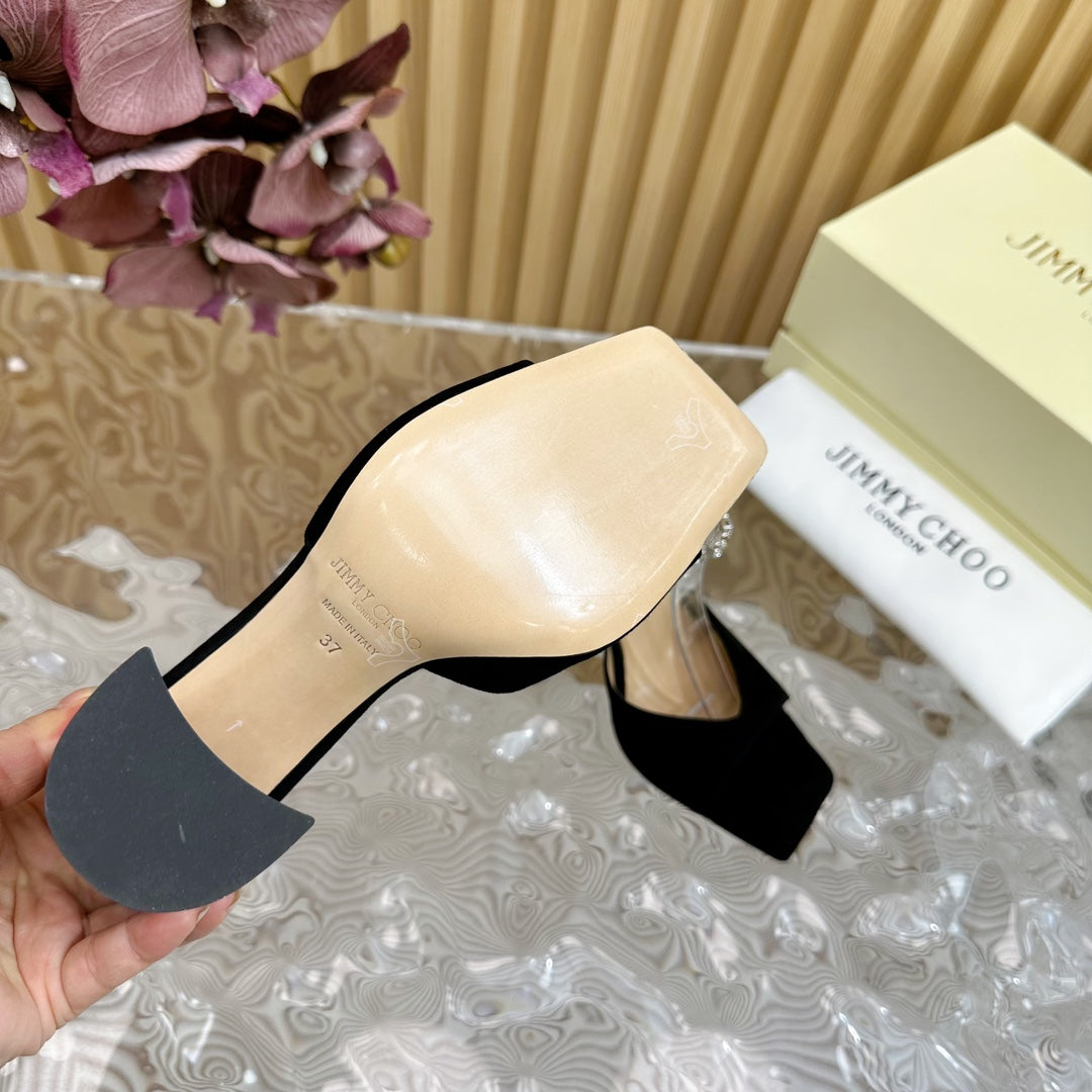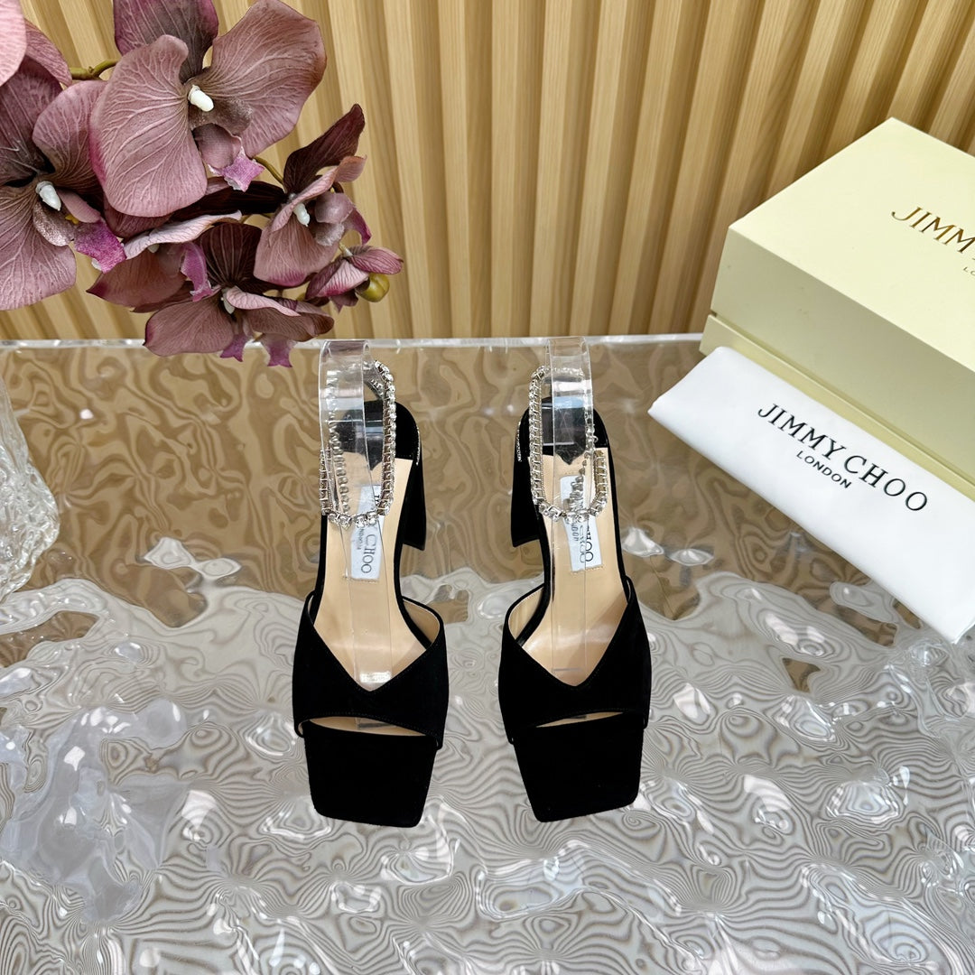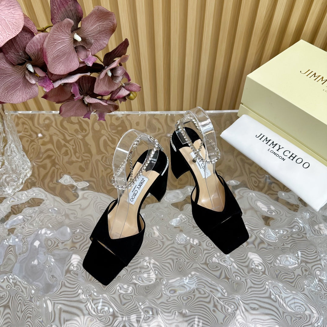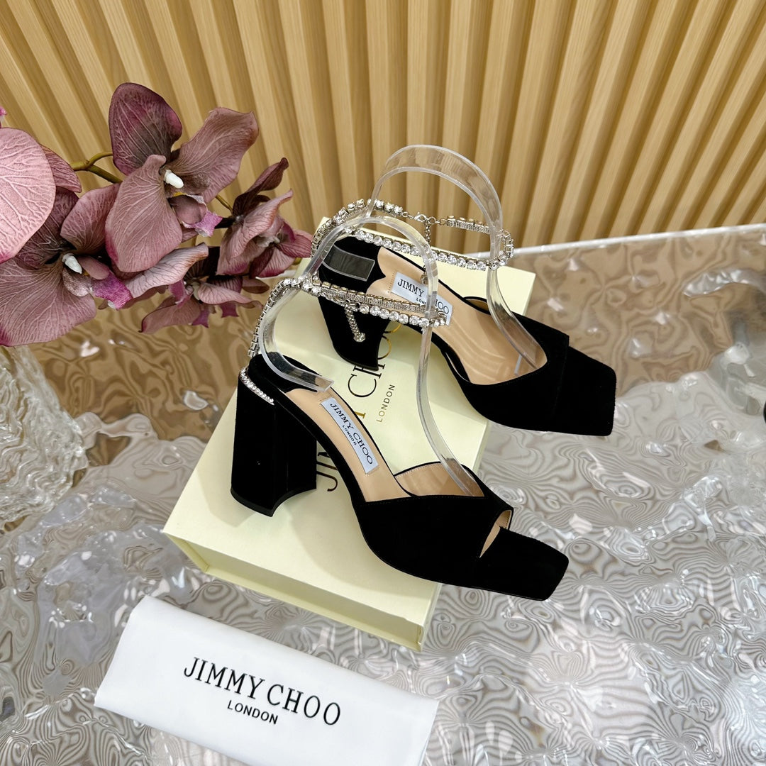 Saeda Sandal Block Heel 85 Black Suede Leather Block Heel Sandals with Crystal Chain 691673