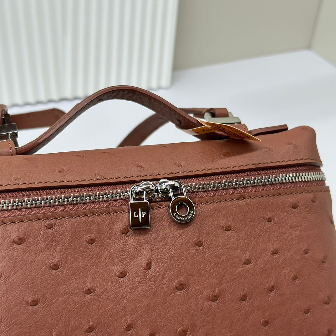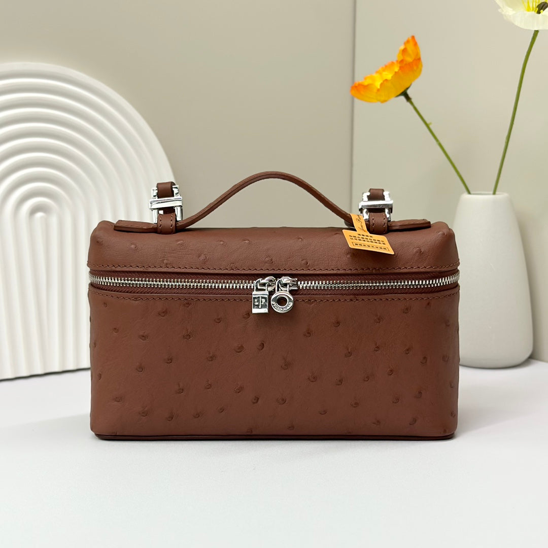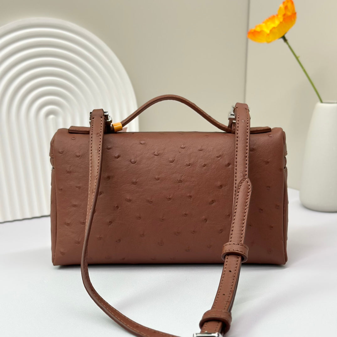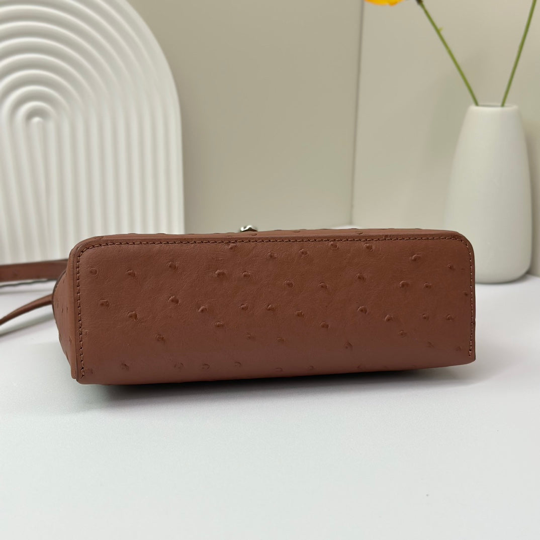 LP Extra Bag 19cm Ostrich Pattern Chestnut Brown Calfskin Silver Hardware