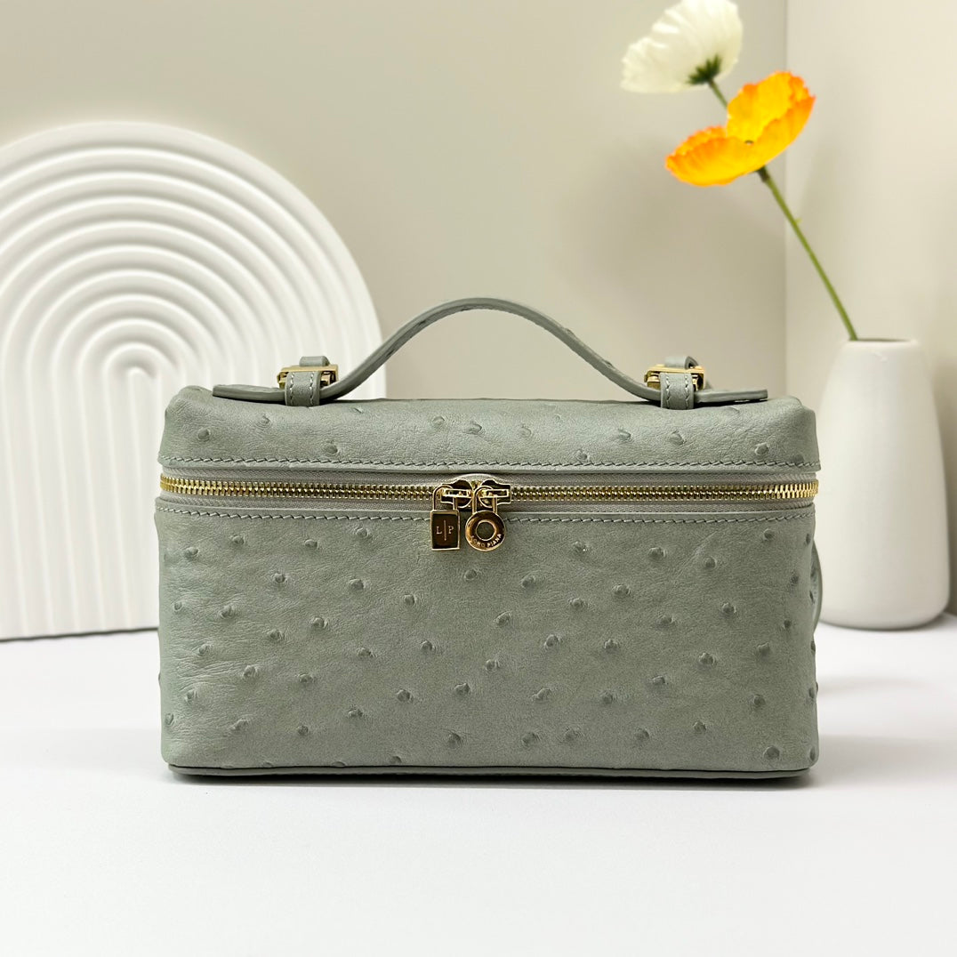 LP Extra Bag 19cm Ostrich Pattern Olive Gray Calfskin Gold Hardware