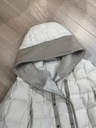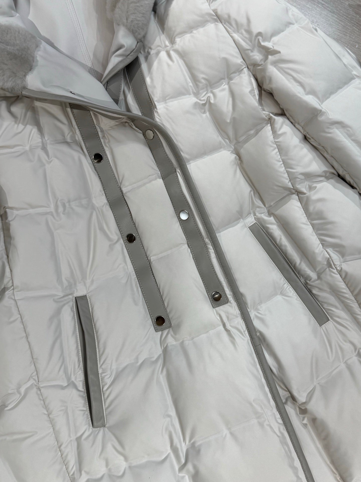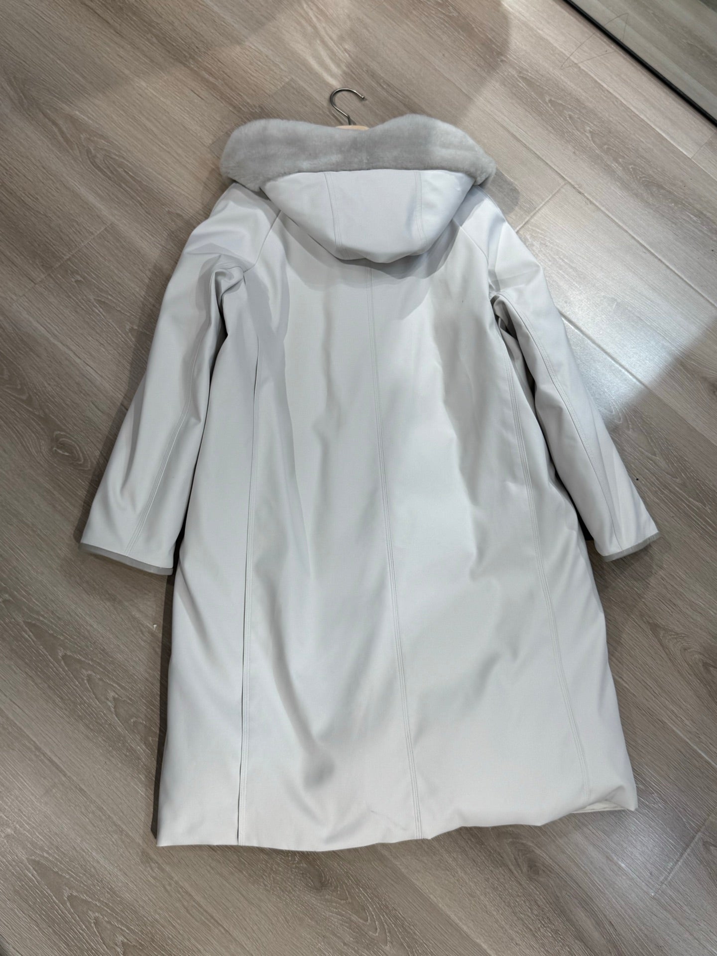 LP 25 Hooded Long Goose Down Light Gray Jacket with Fur Trim 124985
