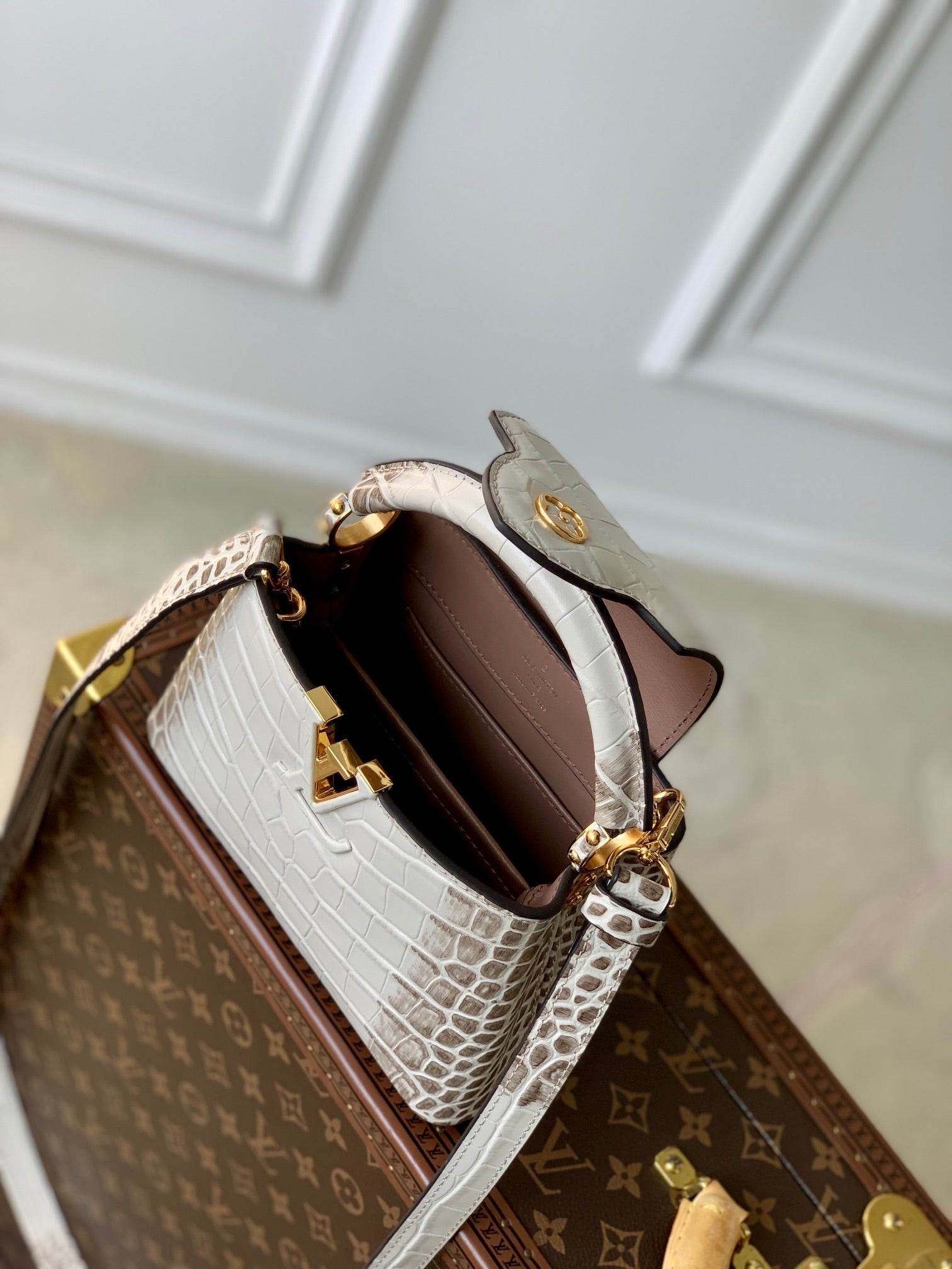CAPUCINES MINI 21 WHITE GREY CROCODILE EMBOSSED CALFSKIN GOLD HARDWARE