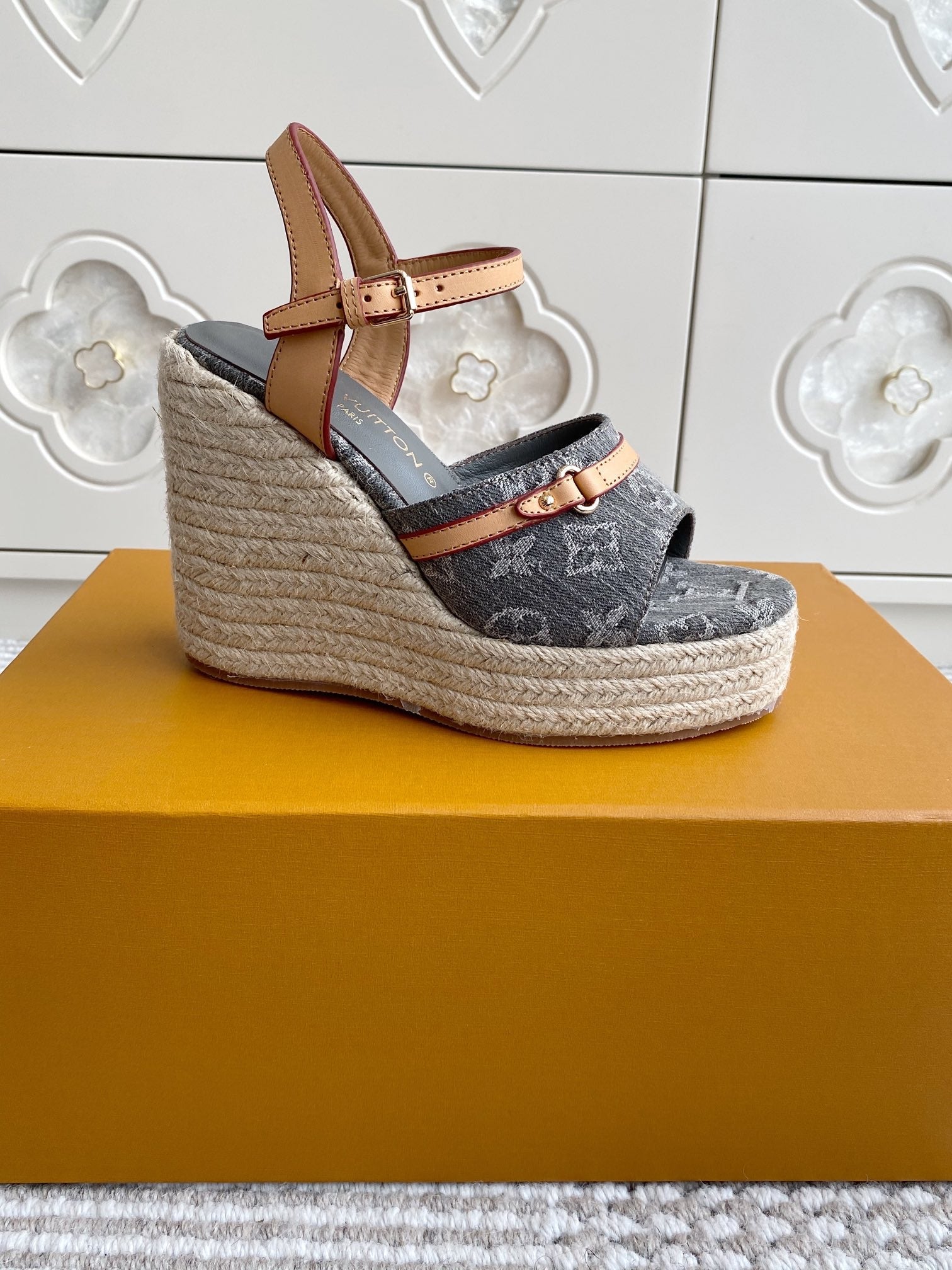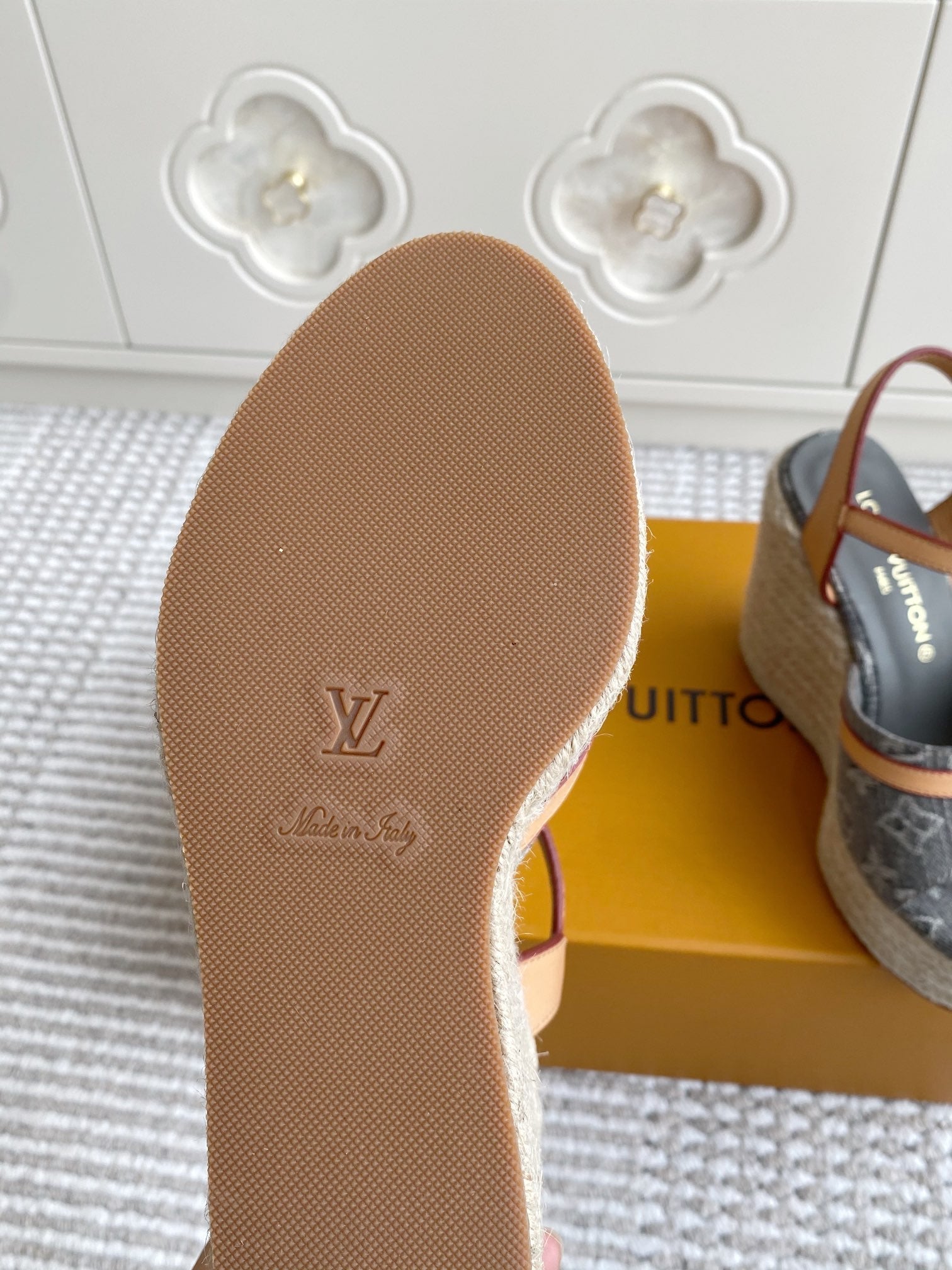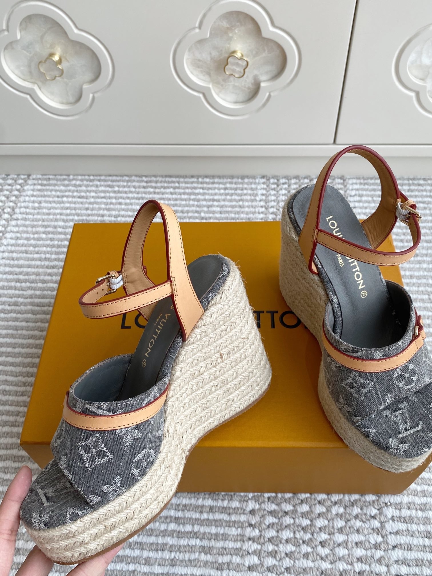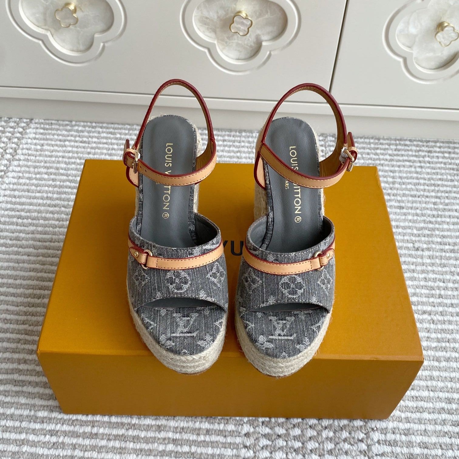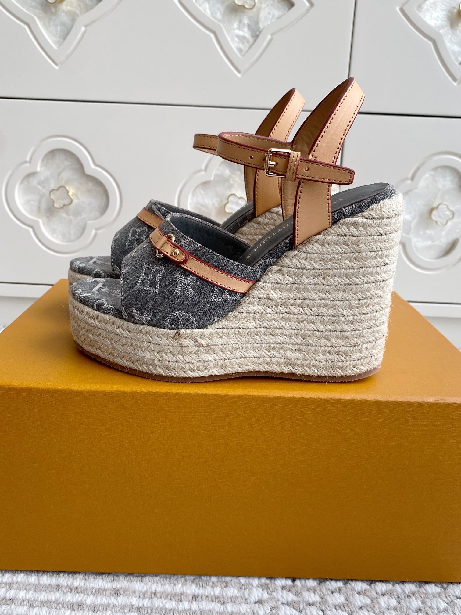 LV Grey Denim Monogram Wedge Sandals 11.5cm Grey Sheepskin Lining 291578