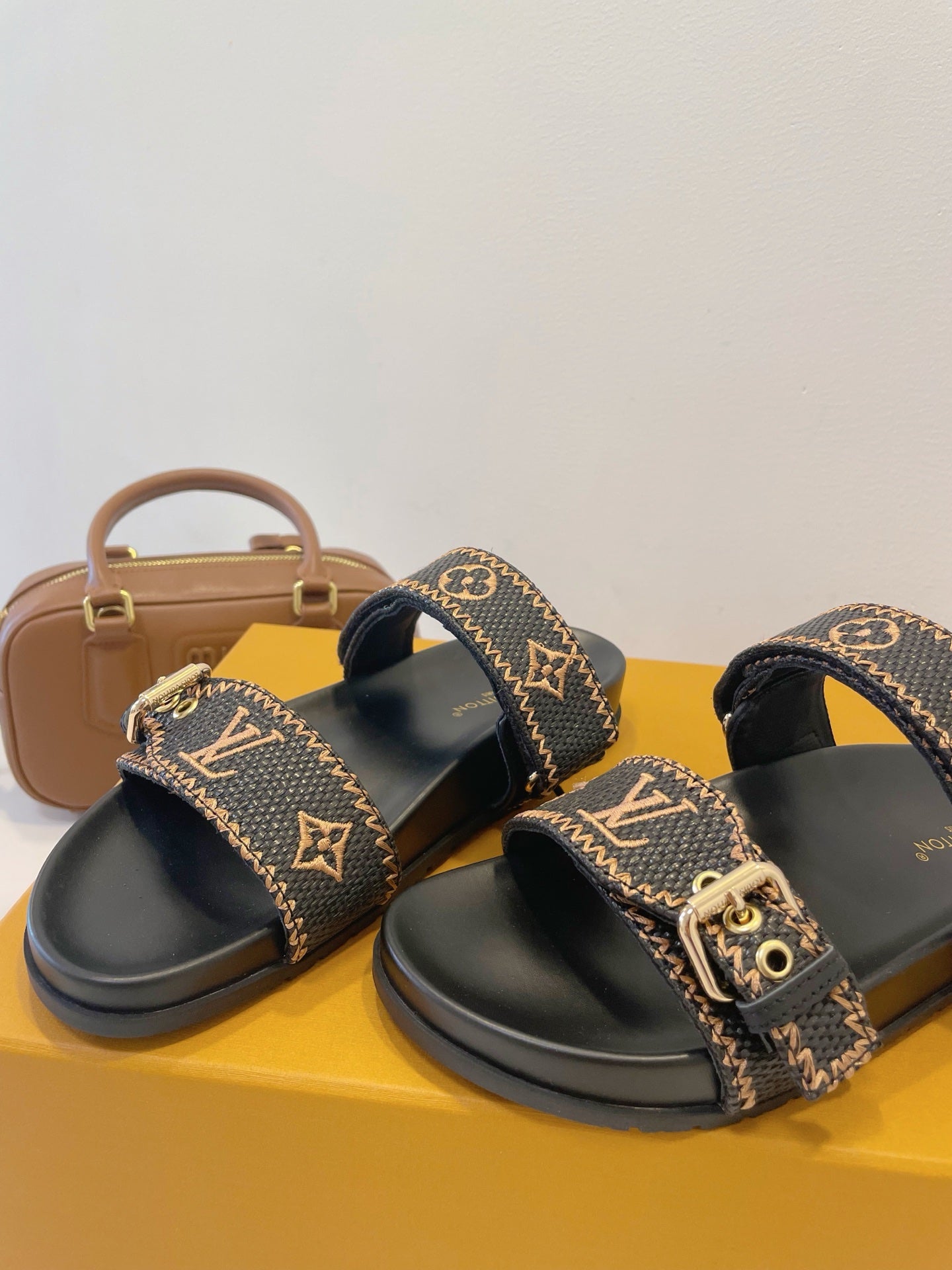 Bom Dia Flat Comfort Mule Brown Black Monogram Embossed Print Classic 241335