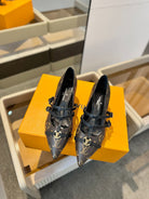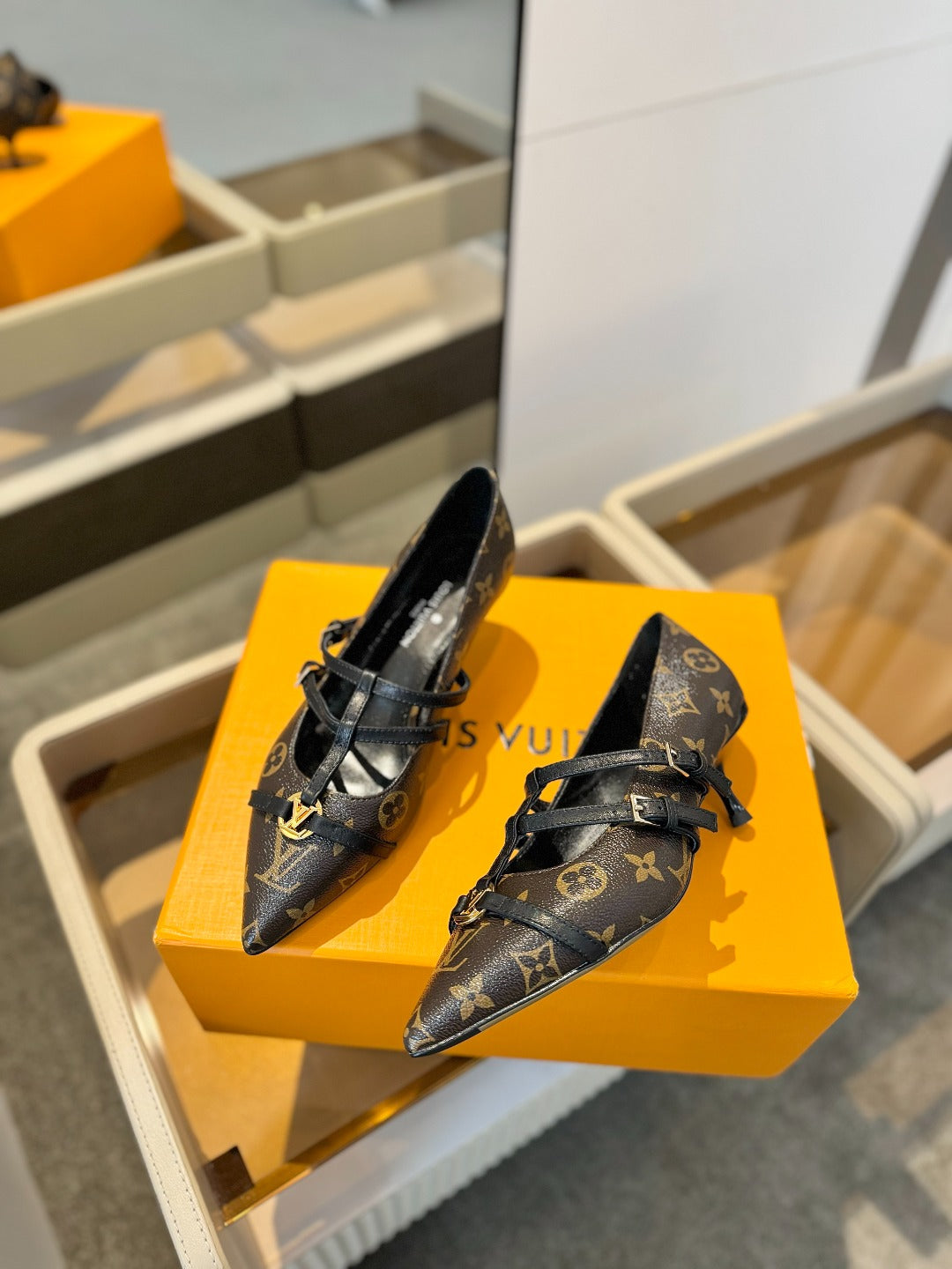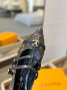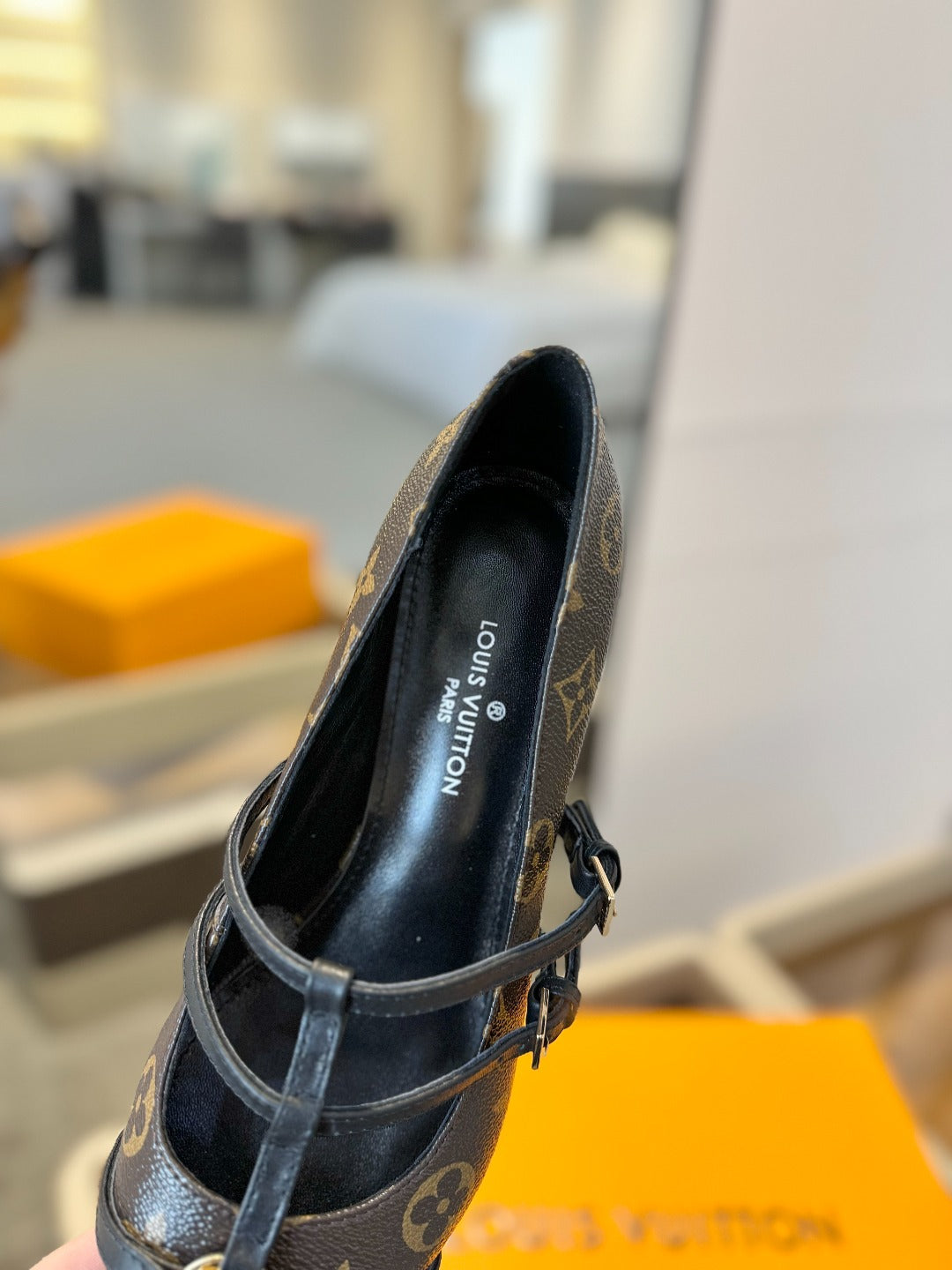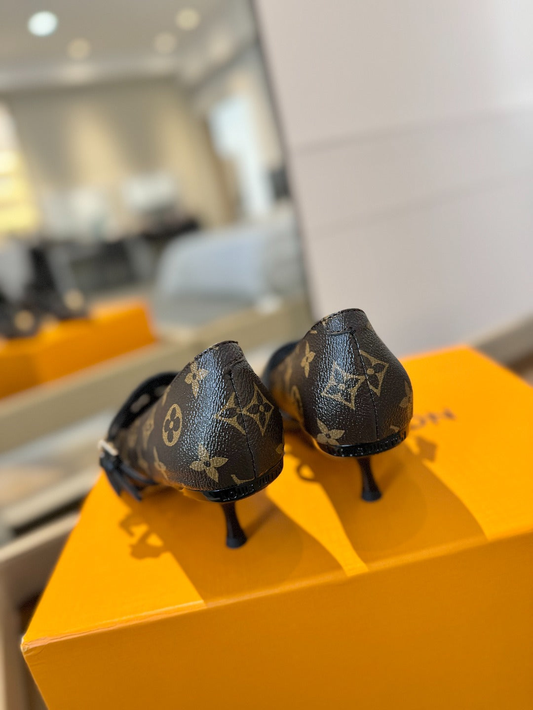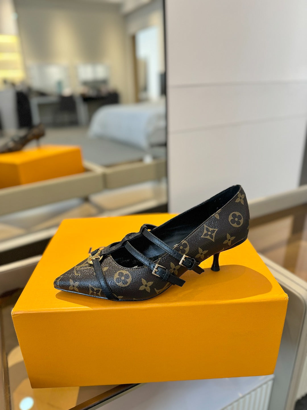 HIGH PUMP 5 CM TRIPLE-STRAP IN CHOCOLATE BROWN MONOGRAM CALFSKIN WITH BLACK STRAP
