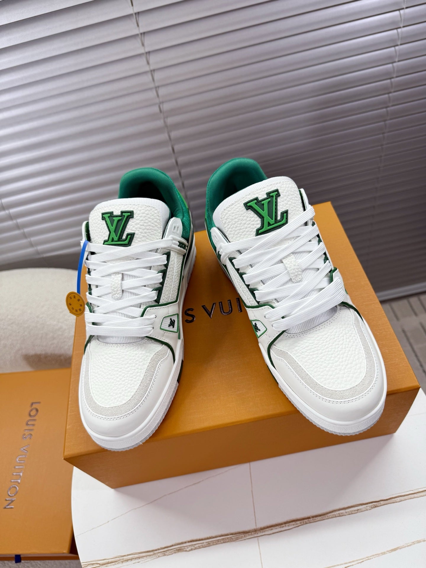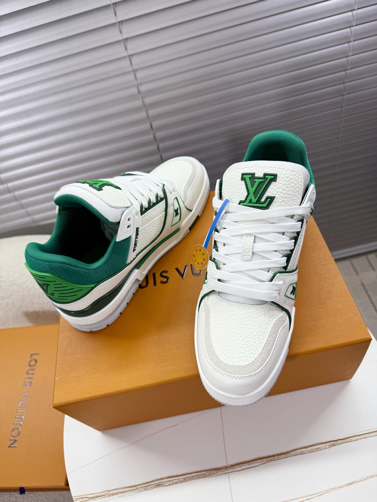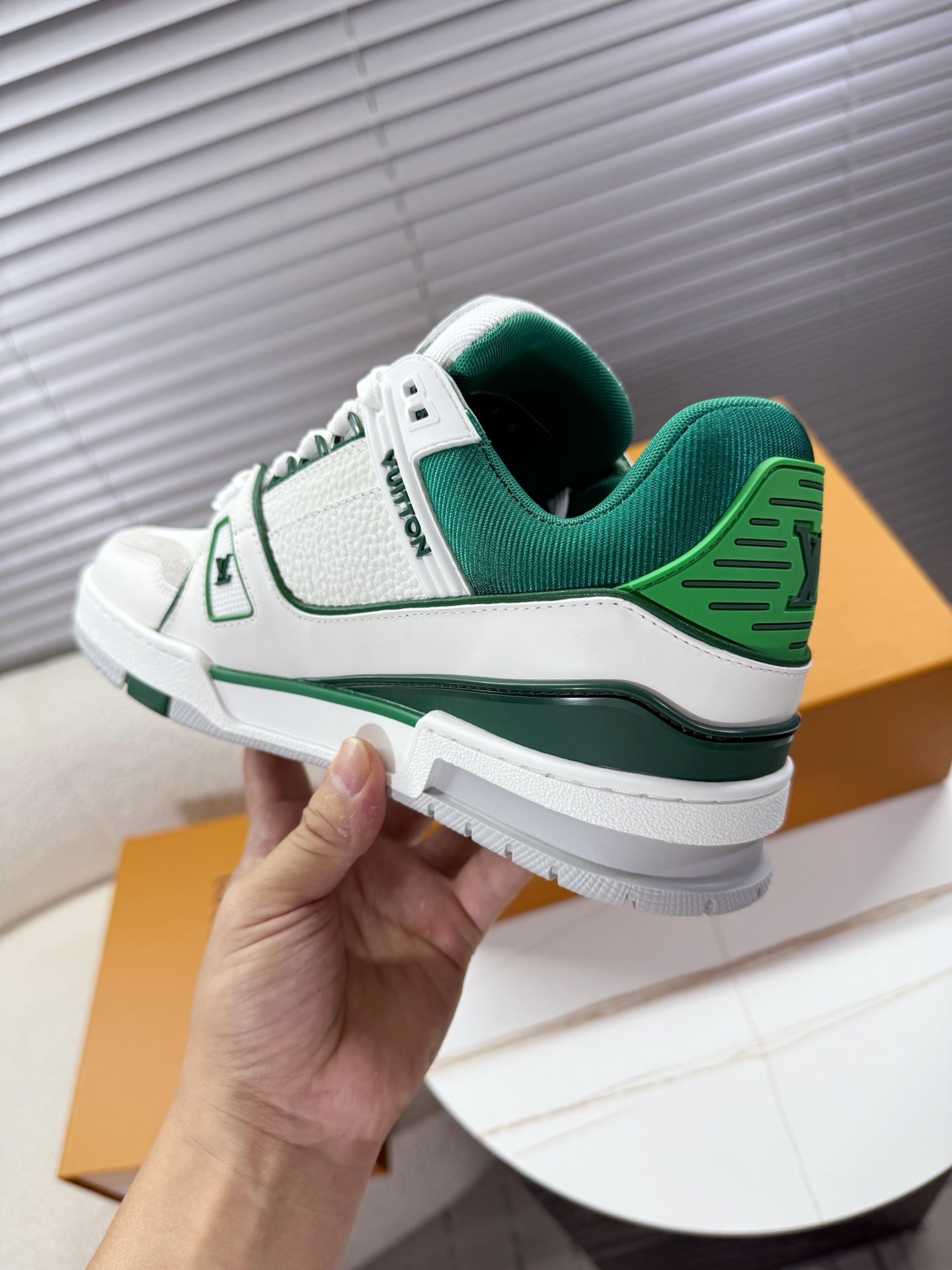 LV 1AIJ41 Trainer Sports Shoes White Green Grained Calfskin 511752