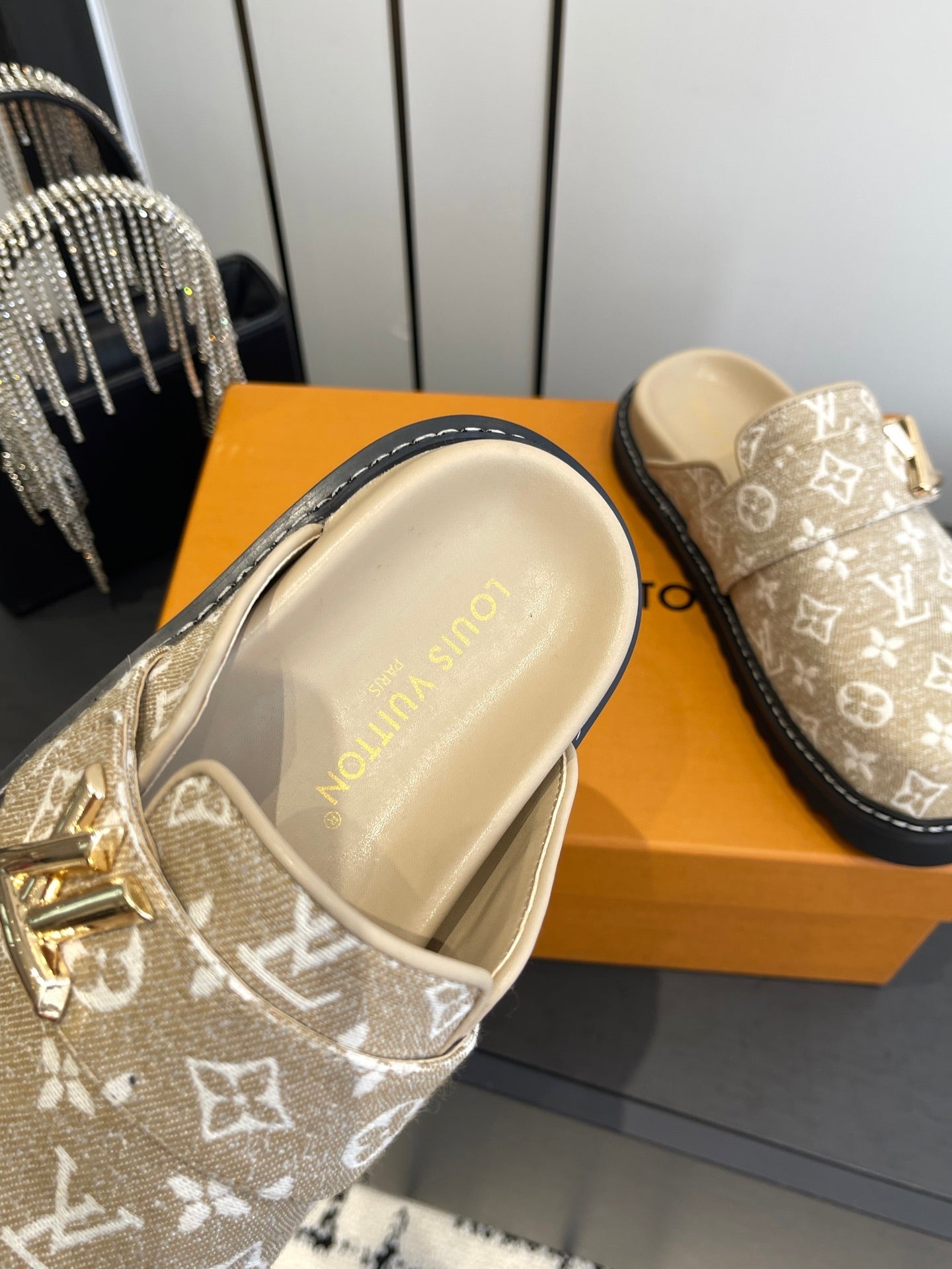 LV Cosy Comfort Mule Sandals Beige Gold Denim Monogrammed 533460