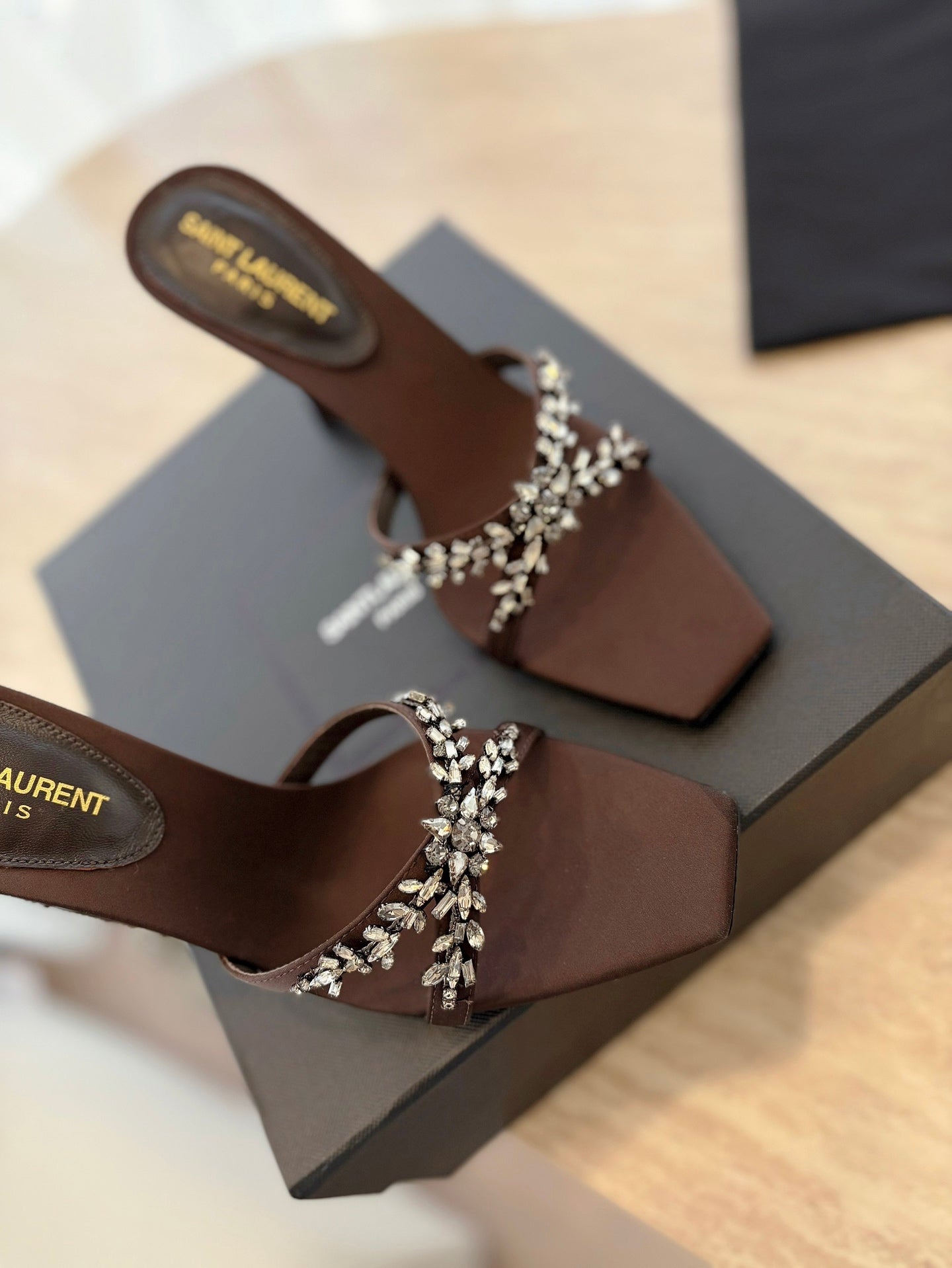 RAV HIGH HEEL 10 CM EMBELLISHED CHOCOLATE BROWN SATIN MULES