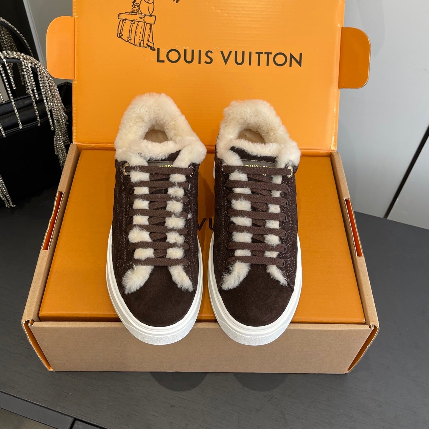 LV Time Out Sneaker 40mm Brown Cream Monogram Denim Suede Fleece Lined 533476