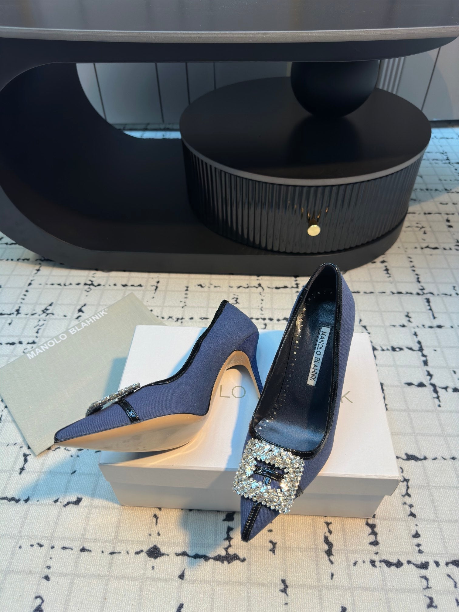 Hangisi 100 Dark Blue Linen with Black Leather Jewel Buckle Pumps 161070