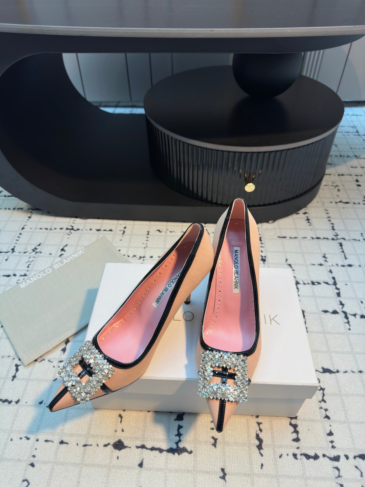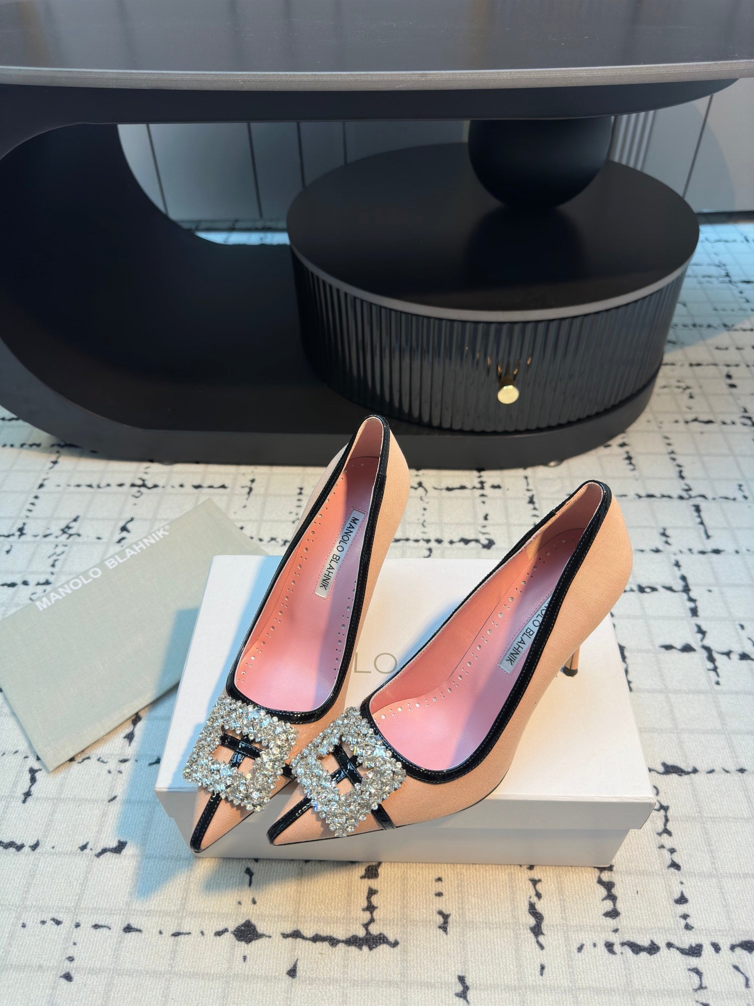 Hangisi 100 Pink Linen with Black Leather Jewel Buckle Pumps 161071