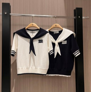 Miu Miu Collar Knotted Short-sleeved Knitted Top Wool tencel